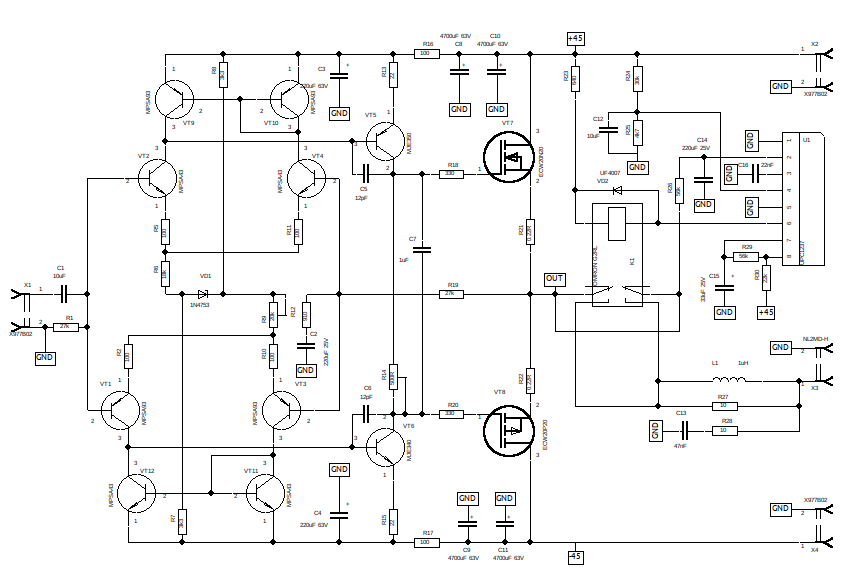 В данный момент в измерительном УНЧ для проверки динамиков и колонок трудится схемка на паре латералов и опере с летающим питанием , оно там два по 24 вольта. Выдает на 8 Омах примерно 25 ватт, мне хватает с головой. Но есть и запасной вариант суперсхемы, это та, над которой вы сейчас трудитесь. Макетирование показало её высокие свойства. Но услышать звучание пока не получилось.Ну вот потому я и зарубил его К.У. локально, и вообще я любитель локальных обратных связей 🙂