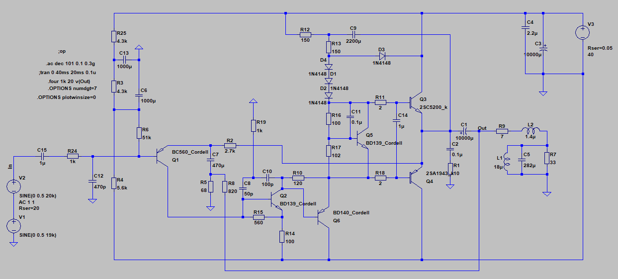 R13 был по памяти 13 Ом, вместо КТ801 был КТ829. До замены КТ801-го искажения были неприемлимыми. Был ли КТ903, или же КТ805 - не вспомню. Среднюю точку выставлял вроде увеличением резистора R14.
