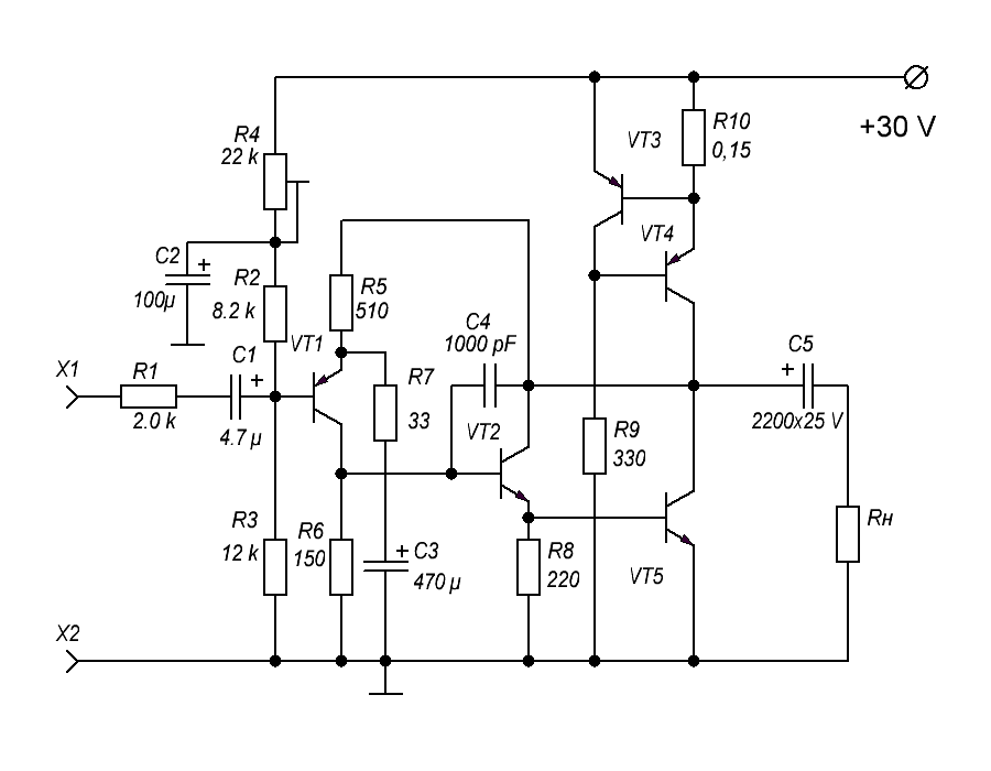 Схема может работать без подбора транзисторов по коэффициенту усиления, однако поскольку она содержит всего 2 каскада усиления, желательно иметь коэффициент усиления транзистора VT1 - не менее 150, транзисторов VT2, VT5 - не менее 50, транзистора VT4 - не менее 80.