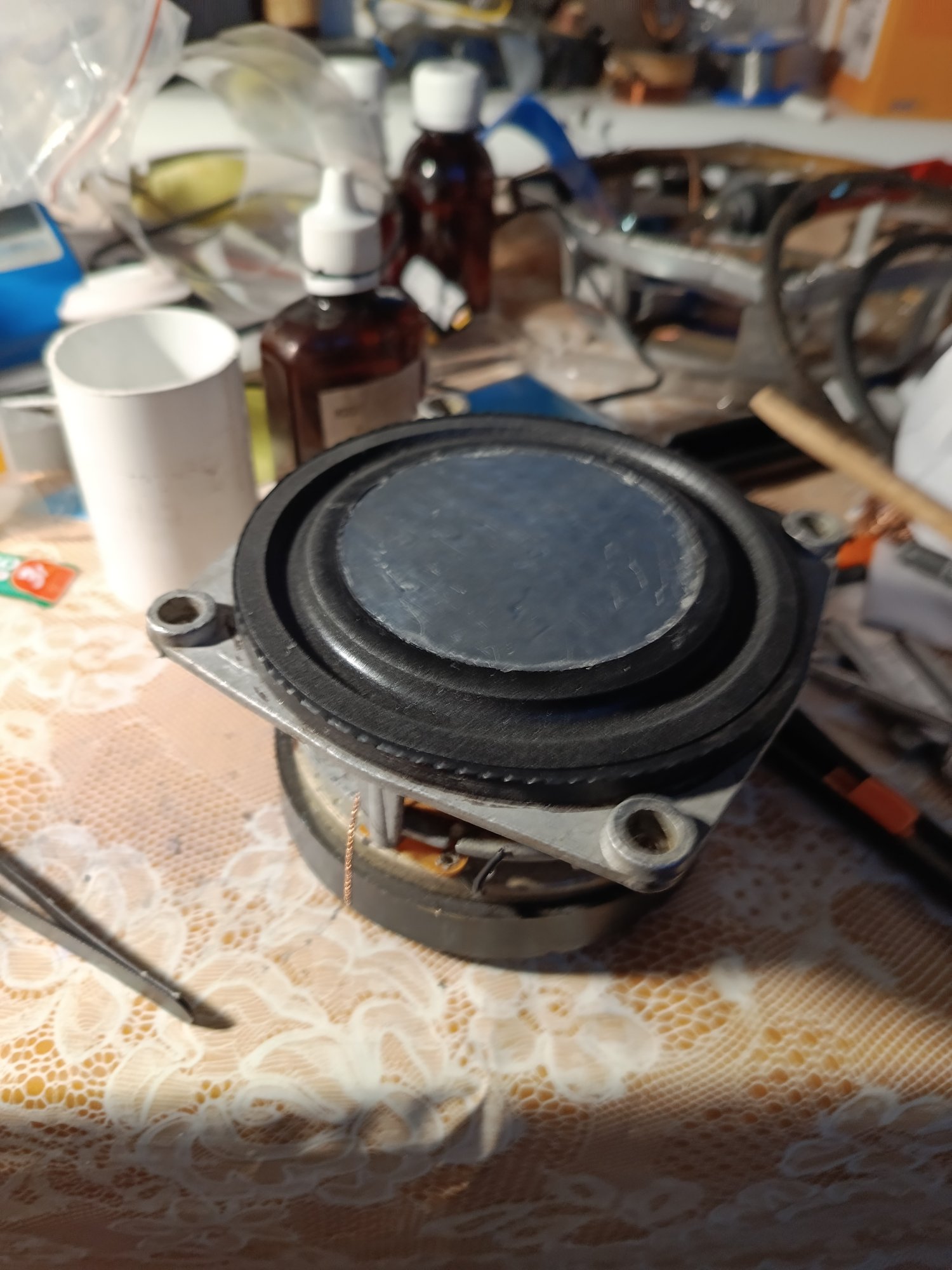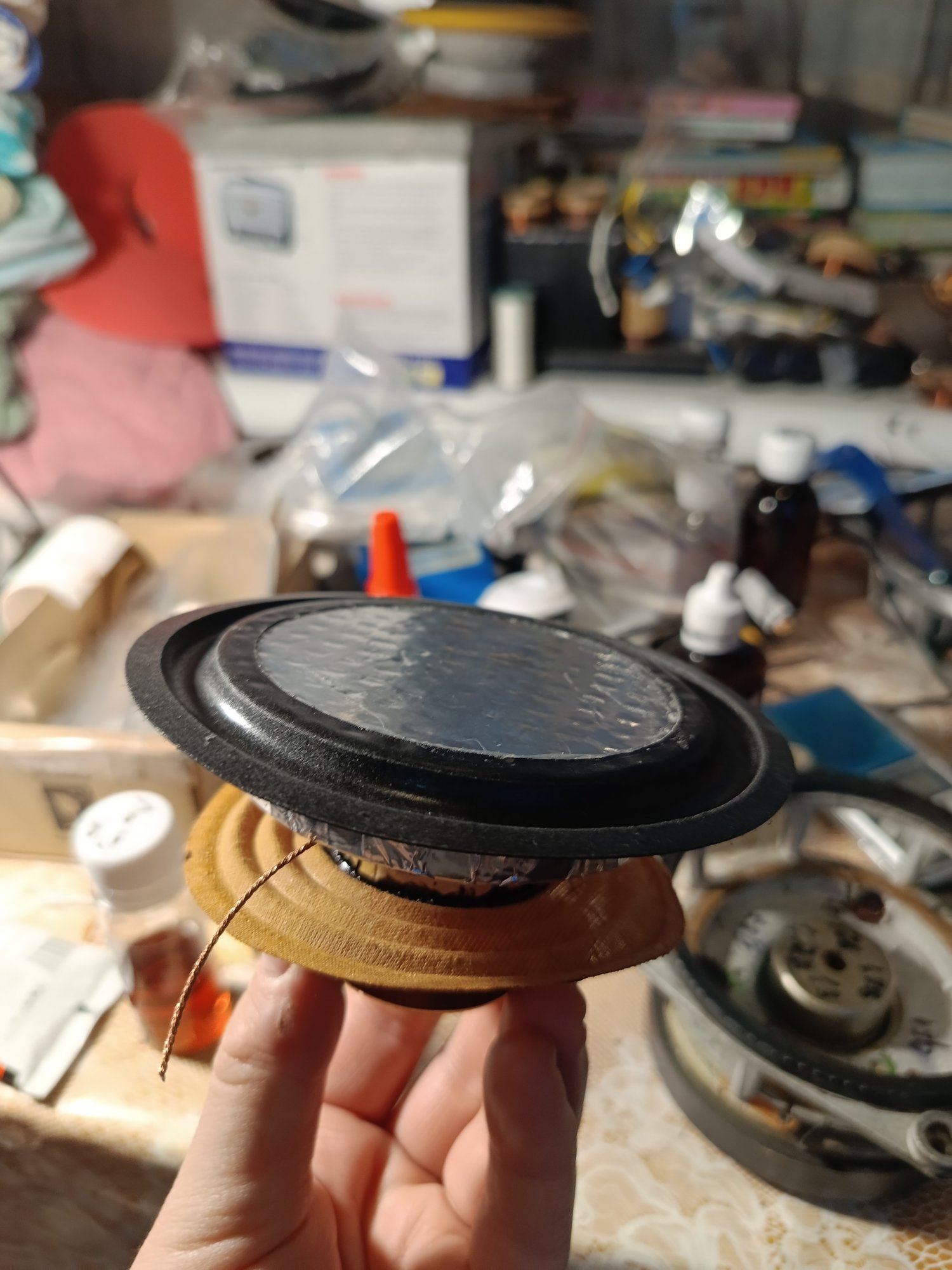 По мне- у такого сендвича есть недостаток в передаче энергии импульса от катушки в воздушную среду-полистерол все таки не достаточно жесткий-не металл однако. Ну это я придираюсь -я то сторонник металла. Вспененный никель, сотовый алюминиевый , анодированный алюминий...