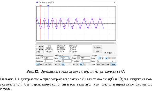 Так вот, на этой самой диаграмме осциллографа алкогольной зависимости заметно, что ток и напряжения на индуктивности конденсатора схожи по роже смыслу вредности фазе. Вполне убедительное предложение! Страшно представить, что было бы заметно, если бы гармонический сигнал таки БЫЛ...