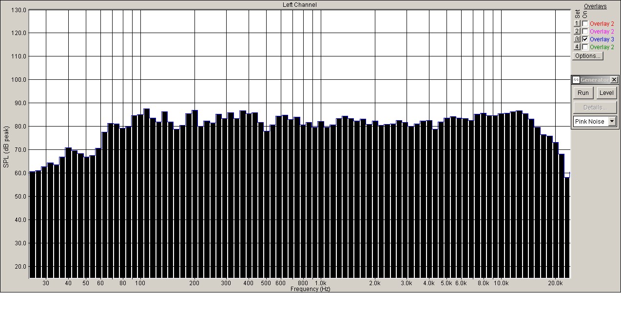 Сделано две серии замеров, по серии на каждый динамик. В серии 10 посылок свипа. Пять замеров под разными углами (в т.ч. и по оси) с расстояния 15-20 см + пять таких же замеров с расстояния 90-100 см. Длительность свипа, частоты и промежутки между посылками выставляются. Накопленные данные с 10-ти замеров по волшебному мановению кнопочки усредняются (Average) и сглаживаются по алгоритму "Psychacoustic" (это между 6 дБ и 3 дБ, и так, как "усреднённое ухо" слышит на том уровне). Получается картинка, по которой предварительно сужу о плохости о пригодности динамика. Регулируемая серия свипов и последующее усреднение (отключаемое) позволяет сделать предварительный замер весьма быстро. А то нужно делать 10 замеров и графиков по отдельности, потом усреднять и пр. А так – всё и сразу:)