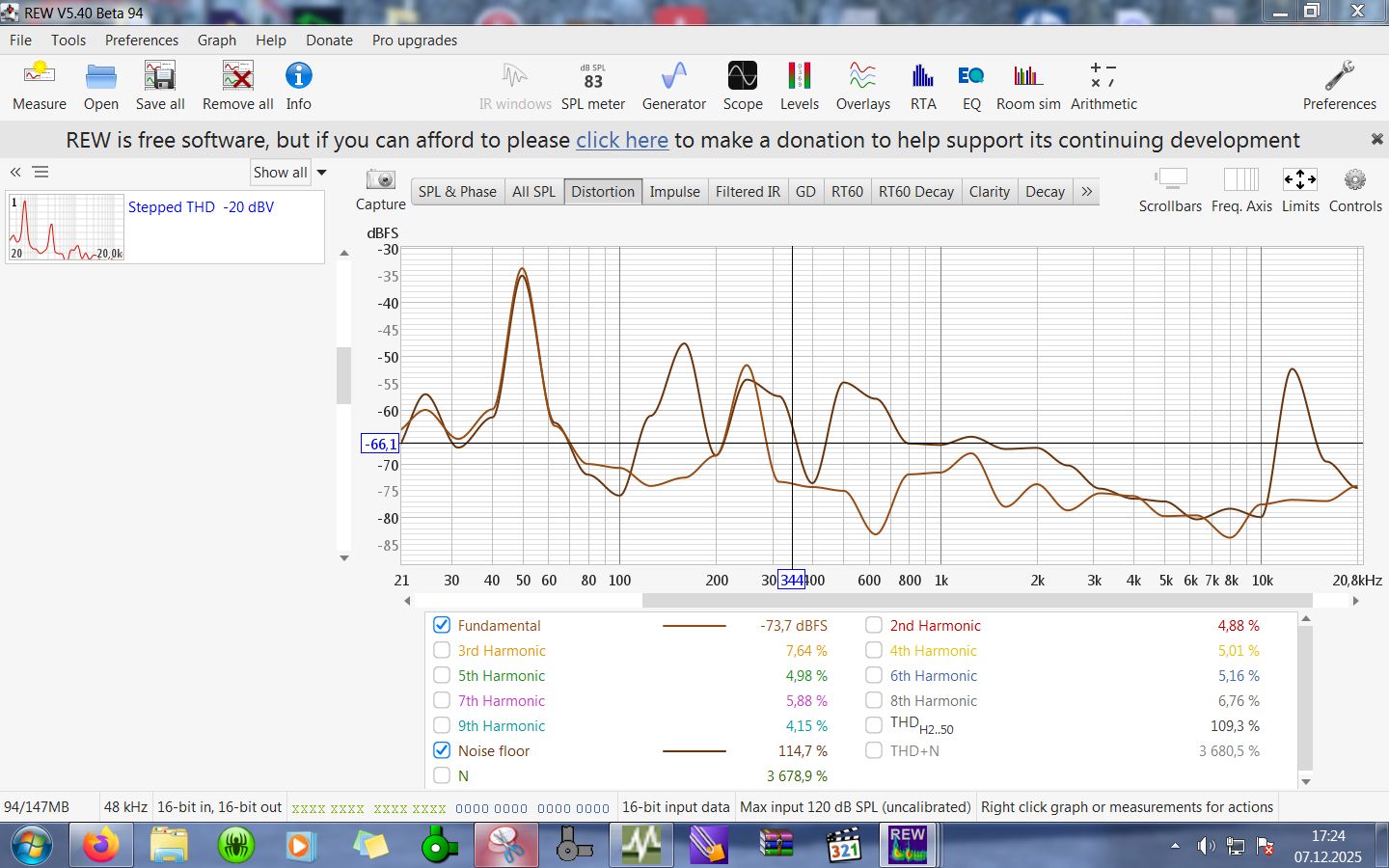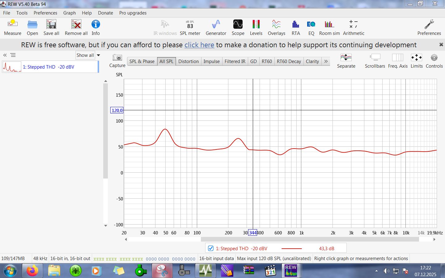 что хочешь посмотреть - если искажения, то галочку поставь на THD. Ты смотришь всякую фигню. А если АЧХ то жми в в верней строчке крайнюю лев. кнопку SPL & Phase.С чем это едят и что это снял простым микрофоном от гарнитуры программы видно.