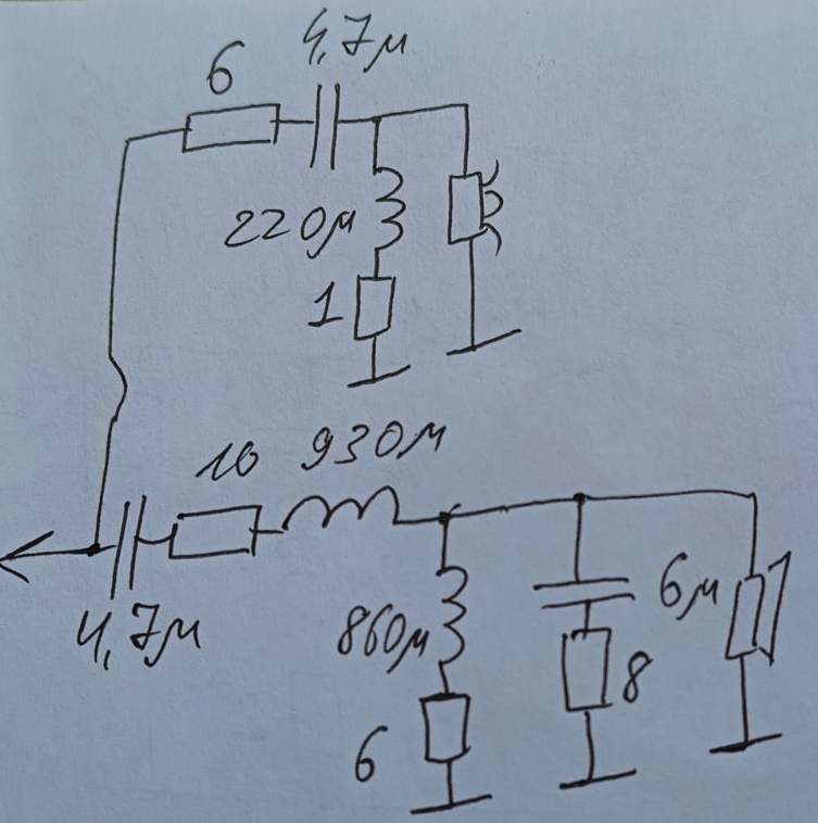 А если резистор на 2ом потом конденсатор 2мкф и следом индуктивность 0,33На ВЧ (стандартный) фильтр. конденсатор 3,9 мгн, индуктивность 0,33 мгн, перед динамиком резистор 2 ома