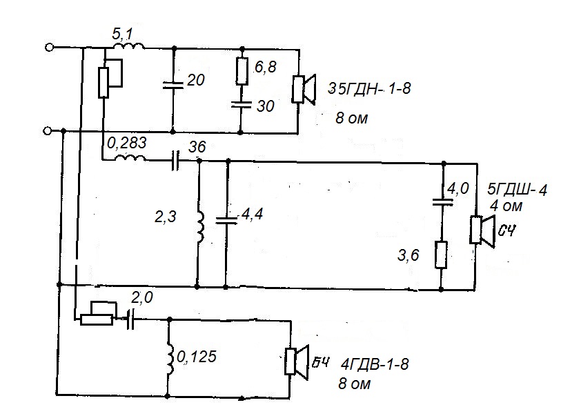Если я правильно понял, то фильтр, найденный вами для динамика 5ГДШ-5-4 выглядит следующим образом: "+" - "резистор" - "емкость" - "индуктивность" - "динамик" - "-". Влияние резистора можно представить как "очень хреновые провода" и изначально расчитывать фильтр, взяв за основу изменения частотной характеристики и сопротивления самого динамика, тем более что номинал резистора выбран без учета затухания вносимого катушками индуктивности НЧ и СЧ фильтров и реальной АЧХ. Либо использовать делитель, который помимо уменьшения уровня сигнала, частично выполняет роль цепи Цобеля, "дисциплинируя" изменения импеданса динамика. Несколько настораживающих моментов: попытка запрячь "коня и трепетную лань", то есть созвучность или характер звукоизвлечения у 75ГДН и 5ГДШ немного разные и на стыке могут возникнуть "разночтения". Если задача не в том что "лишь бы сунуть", попробуйте подыскать или 20ГДС или Alphard 1300, они недорогие и хорошо себя чувствуют в небольшом объеме изолирующего бокса. И фильтры для них, уважаемый А.Б. уже "выстадал":).(Пищалку все равно менять). Объем корпусов? Если S-70 в рабочем состоянии, с родным усилителем, работающим датчиком ЭМОС, тогда "счастье", во всех других случаях, корпус безнадежно мал.