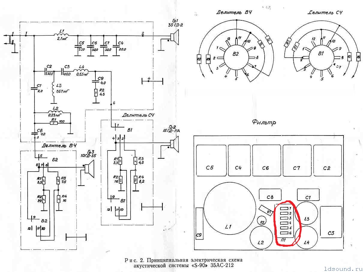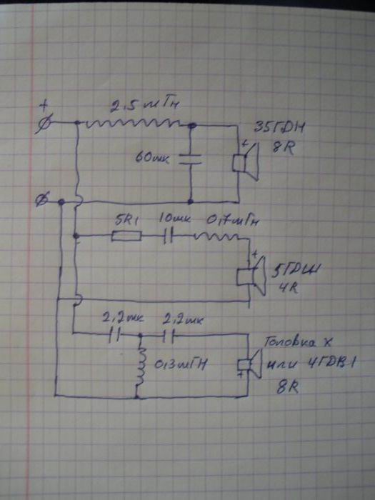 3-вч,6-сч.2-нч.4-общий всем.Точечка у вывода каждого динамика указывает на соблюдение фазировки.
