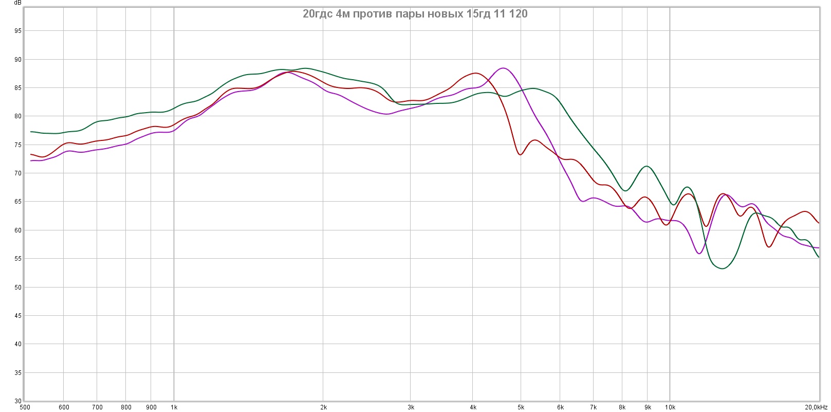 Попробуйте 20гдс 4м 8.Именно 4м, делали их в Харькове. Имеют резинотканевый подвес, в отличии от Бердского 20гдс 4.Играют намного ровнее 15гд 11 и 20гдс 1(3) 8, без горбов и до 6к герц.Вот мои замеры: 20гдс 4м (зеленый) против 15гд11 120 1979 ("новые",были в заводских коробках).