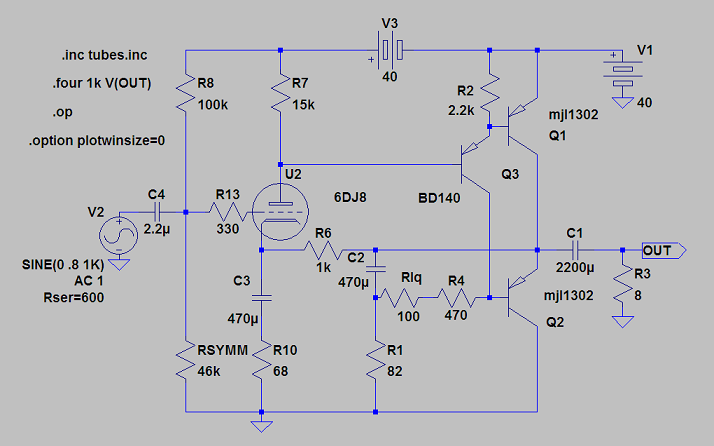 що автоматично стає 2.52 Vp, або 5.04 Vpp. Це відповідає 8,39 mAp в навантаження 300 Ом. Тепер додамо по пару Вольт з кожного боку на квазинасичення транзисторів вихідного каскаду.
