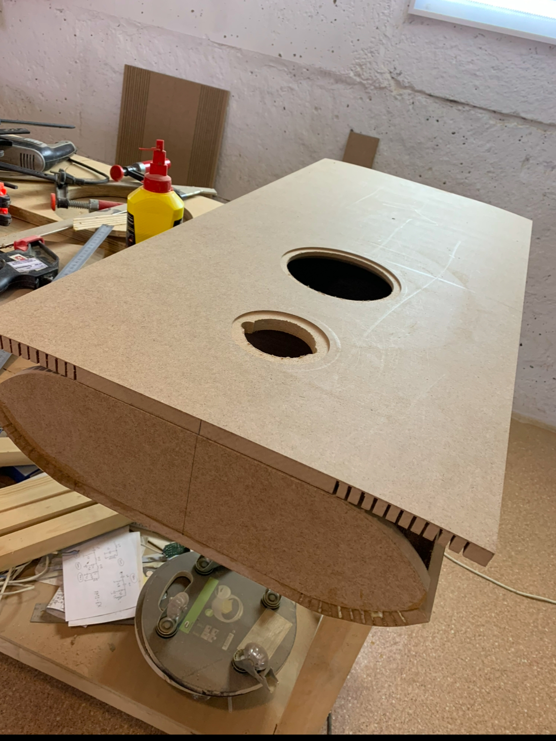 Но в идеале конечно надо боковые части соединить под 45°, а переднюю и заднюю пустить на 5 миллиметров вглубь. Звуку не поплохеет такая глубина, а корпус будет смотреться интересно. Особенно с грилями.