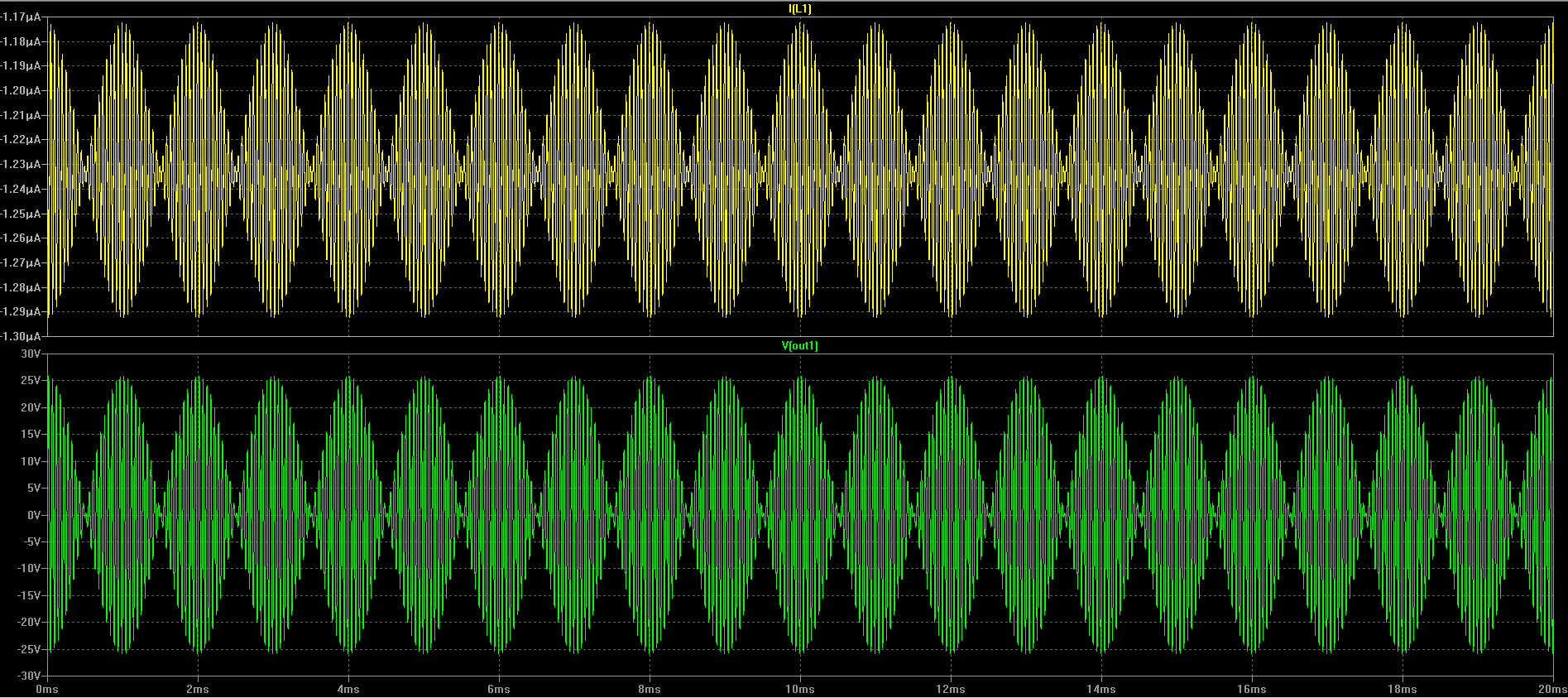 А это сверху ток через дроссель, снизу напряжение на выходе усилителя: