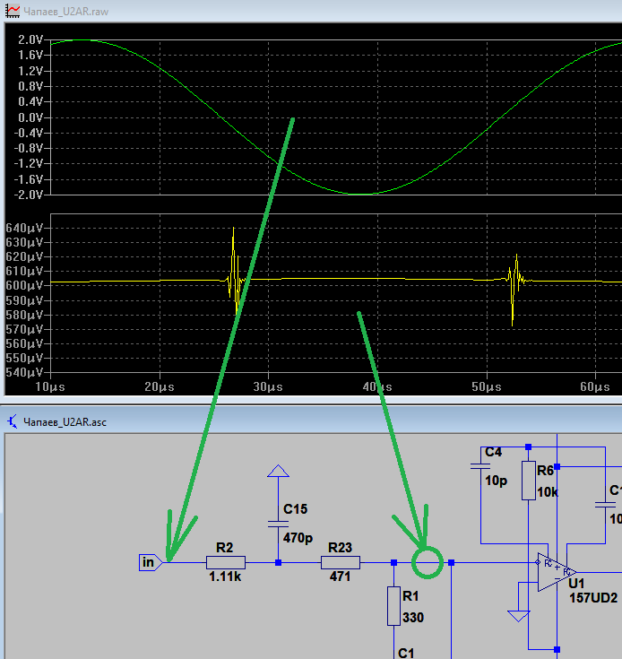 Теперь посмотри в зелёных окошечках искажения на входе усилителя напряжения - совсем неприличные 0,872%.