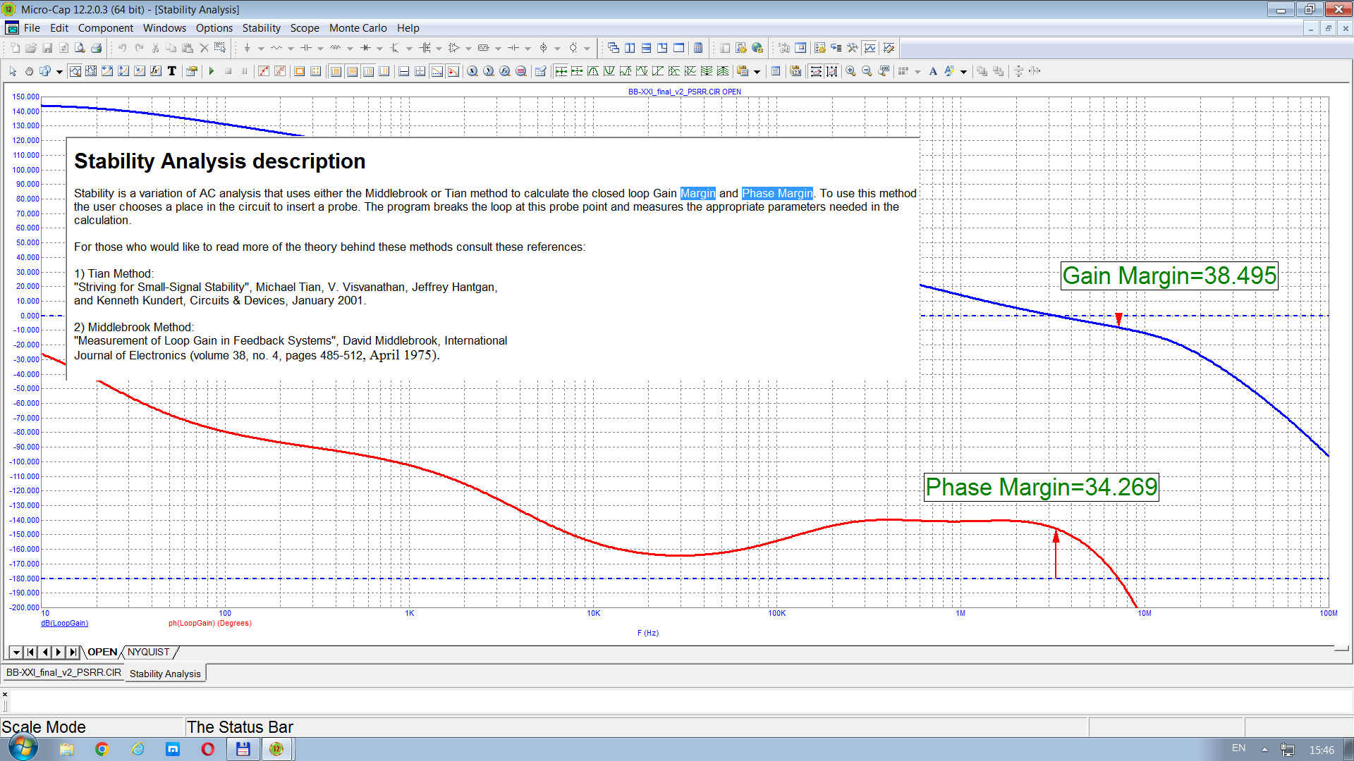 Это не он измеряет, а встроенный скрипт Микрокапа. Он тупо доходит до точки, где 180 градусов пересекает фаза и соответственную точку на графике АЧХ отмечает, фиксируя цифру как запас по амплитуде. Ну простенький скрипт, что с него взять...