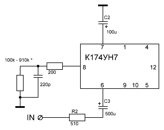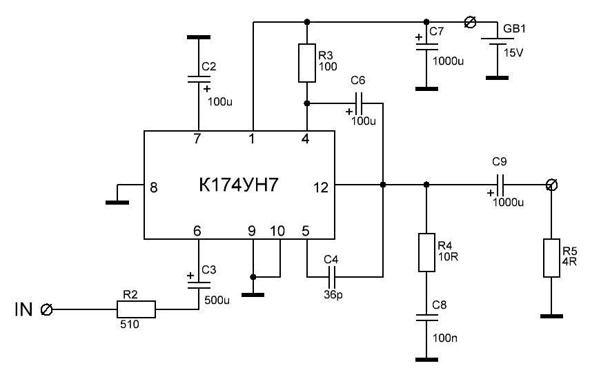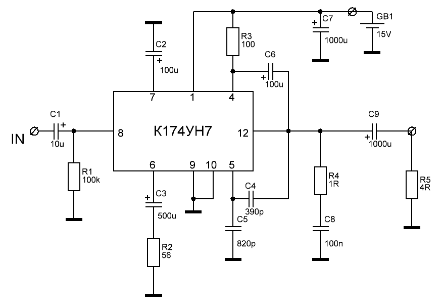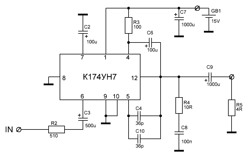 Гарна робота.Эксперимент с К174УН7, часть 1Решил в железе поэкспериментировать с К174УН7, в плане улучшения схемы. Плату взял от старого телевизора (3УСЦТ или УПИМЦТ, не помню). Номиналы резисторов и конденсаторов согласно плате, позиционно не стал соблюдать в схеме. С5 был керамический без обозначения, 820 пФ показало при измерении. Совместно с С4 на 390 пФ они гораздо меньше стандартных в справочнике (510 и 2700 пФ). Максимальная мощность до клиппинга 4 Вт при 15В питания.