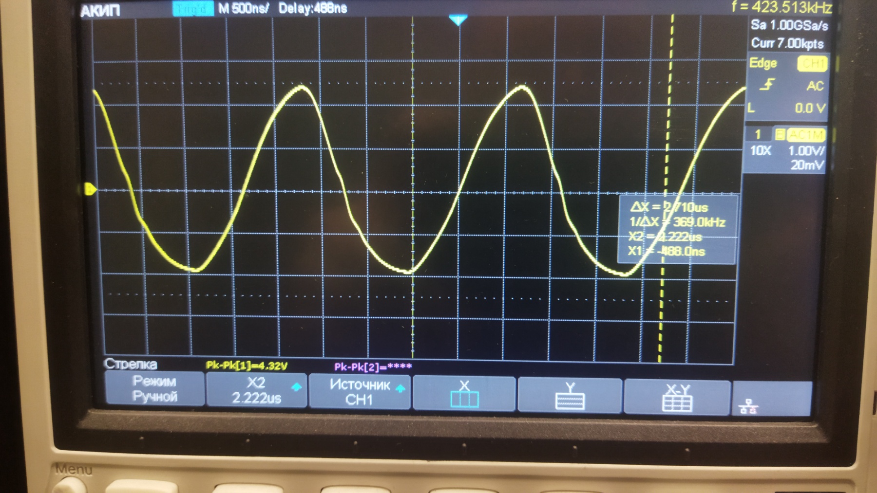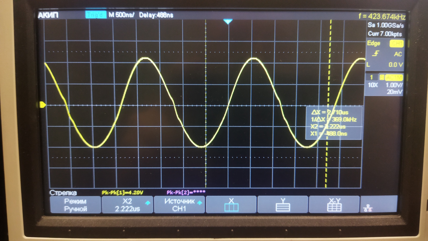 Измерил полосу по -3 дБ, получилось 420 кГц, фото синуса 420 кГц