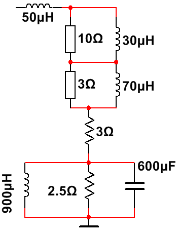 Цепочка Цобеля для высокого раздела частот 8 мкФ+11 Ом, сопротивление 8,7 Ома от 1 до 5 кГц.
