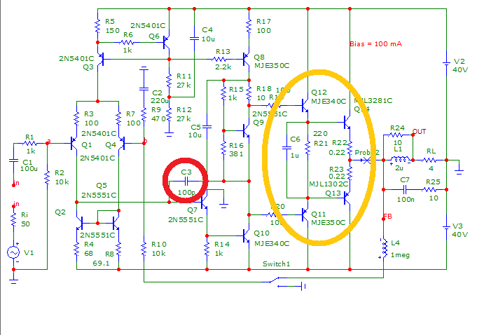 Нормальні люди від доісторичного 1971 року вибирають режимний струм вихідної пари, що працює в режимі класу АВ, за заповітом дідуся Олівера. Та з огляду на fT транзисторів.