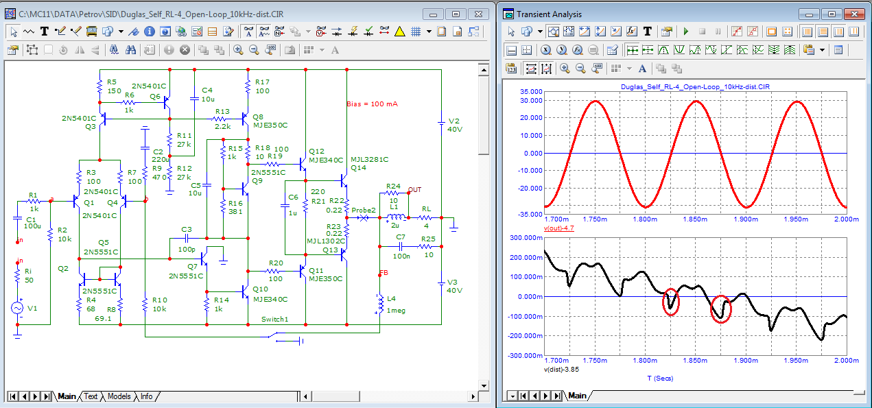 Разомкнем ООС и посмотрим продукты искажений. ООС существенно ослабляет низшие гармоники, а высшие (которые есть в кроссоверных искажениях) подавляются по ряду причин не так эффективно.