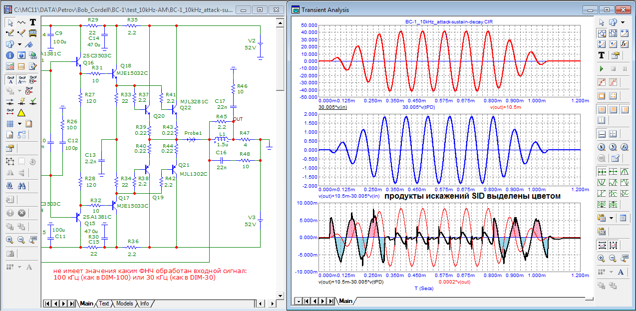 При питании +-52 В имеем почти двукратный запас для BC-1. Как видим искажения начинают расти уже при подходе к переходам через ноль и прекращаются не сразу после окончания переходов через ноль