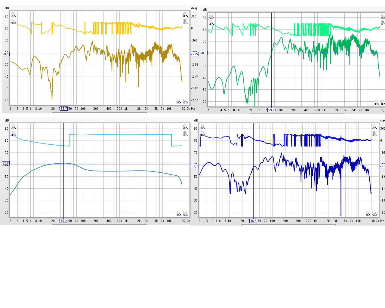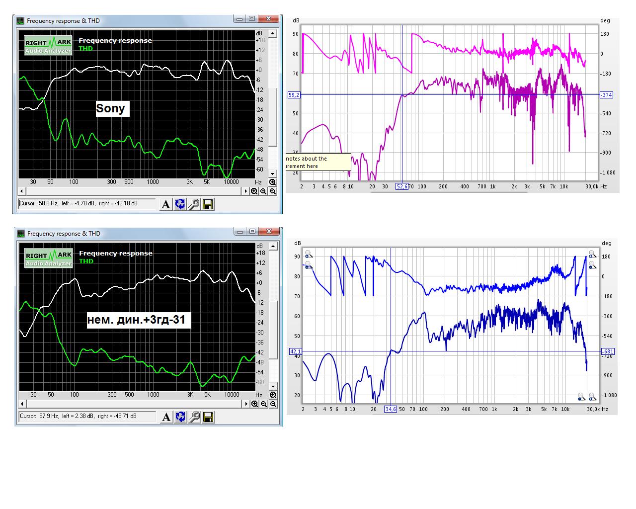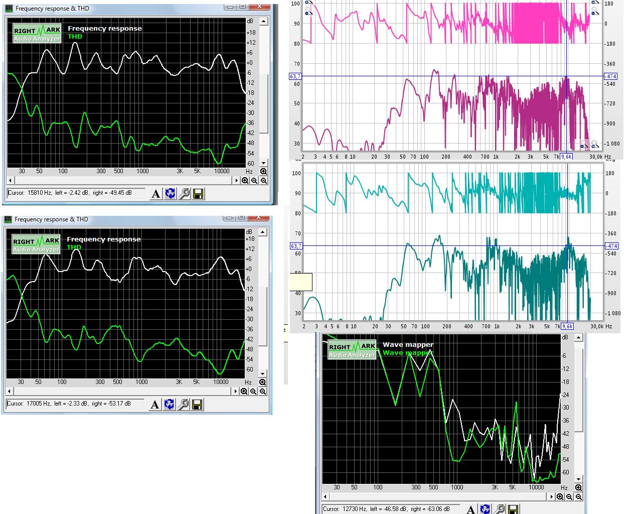 Два верхних графика, это разные АС лев. верх - со всеми ВЧ динамиками и передней мордой с удлиненной примерно на 8 см трубой фазоинвертора, прав верх - с одним ВЧ динамиком и просто с дыркой в корпусе без трубы, а ниж. лев - без доп корпуса.