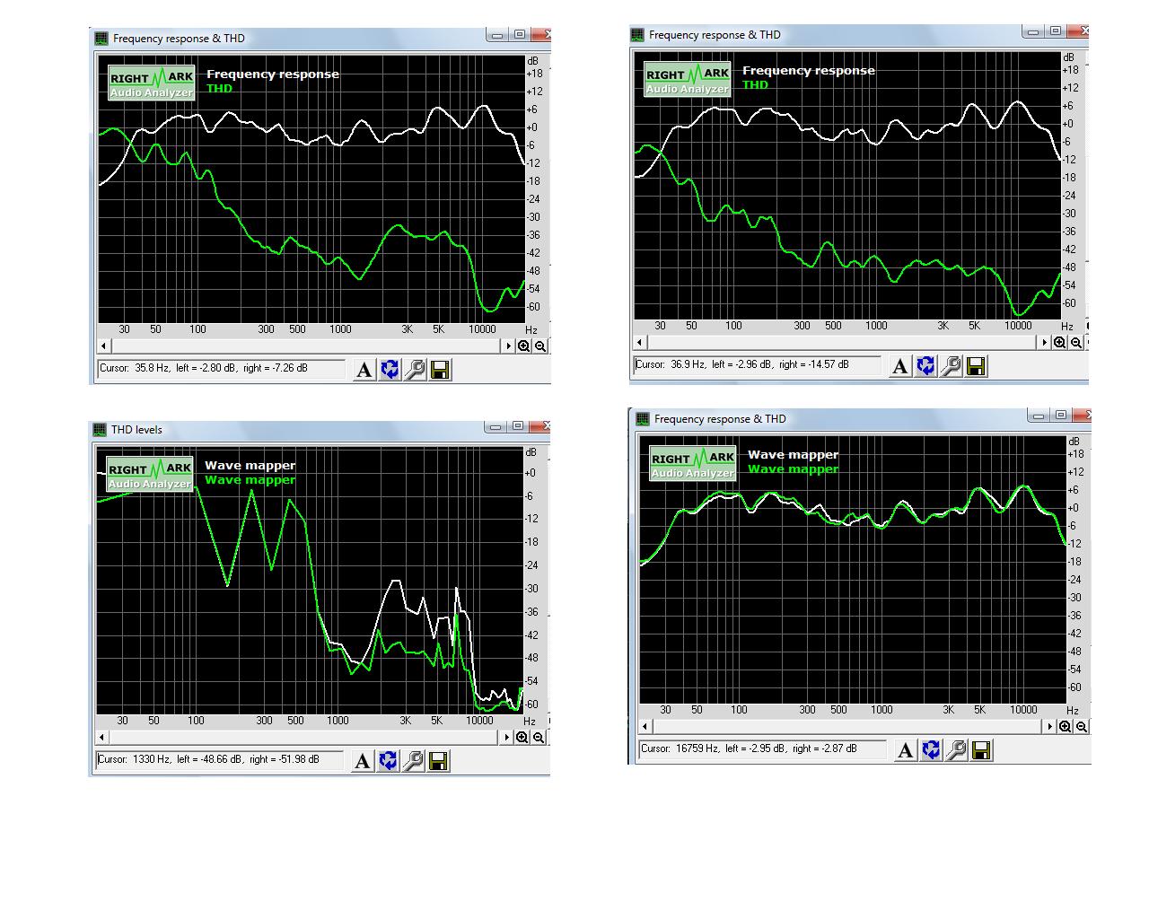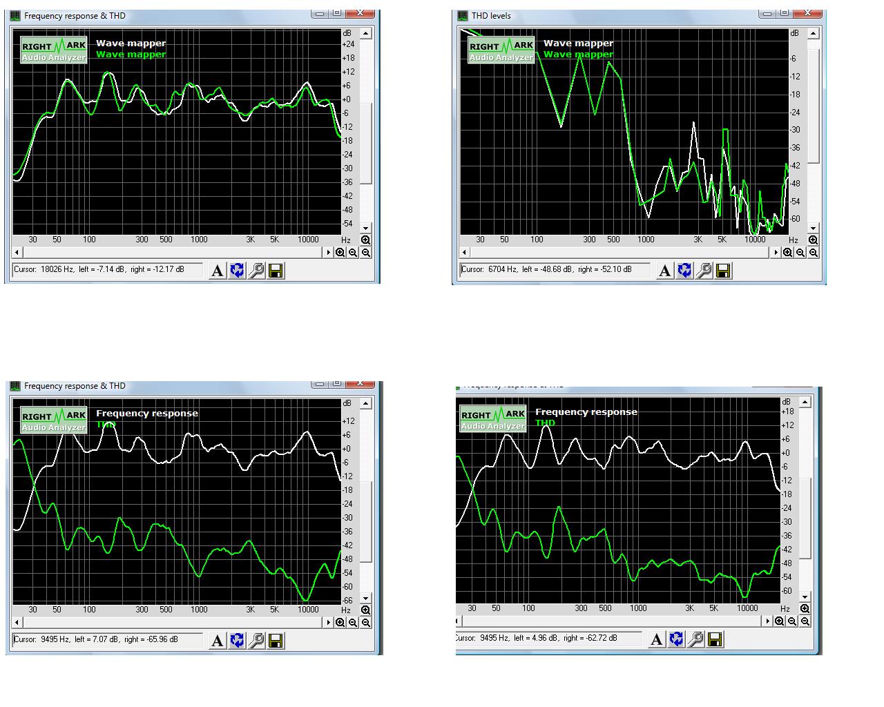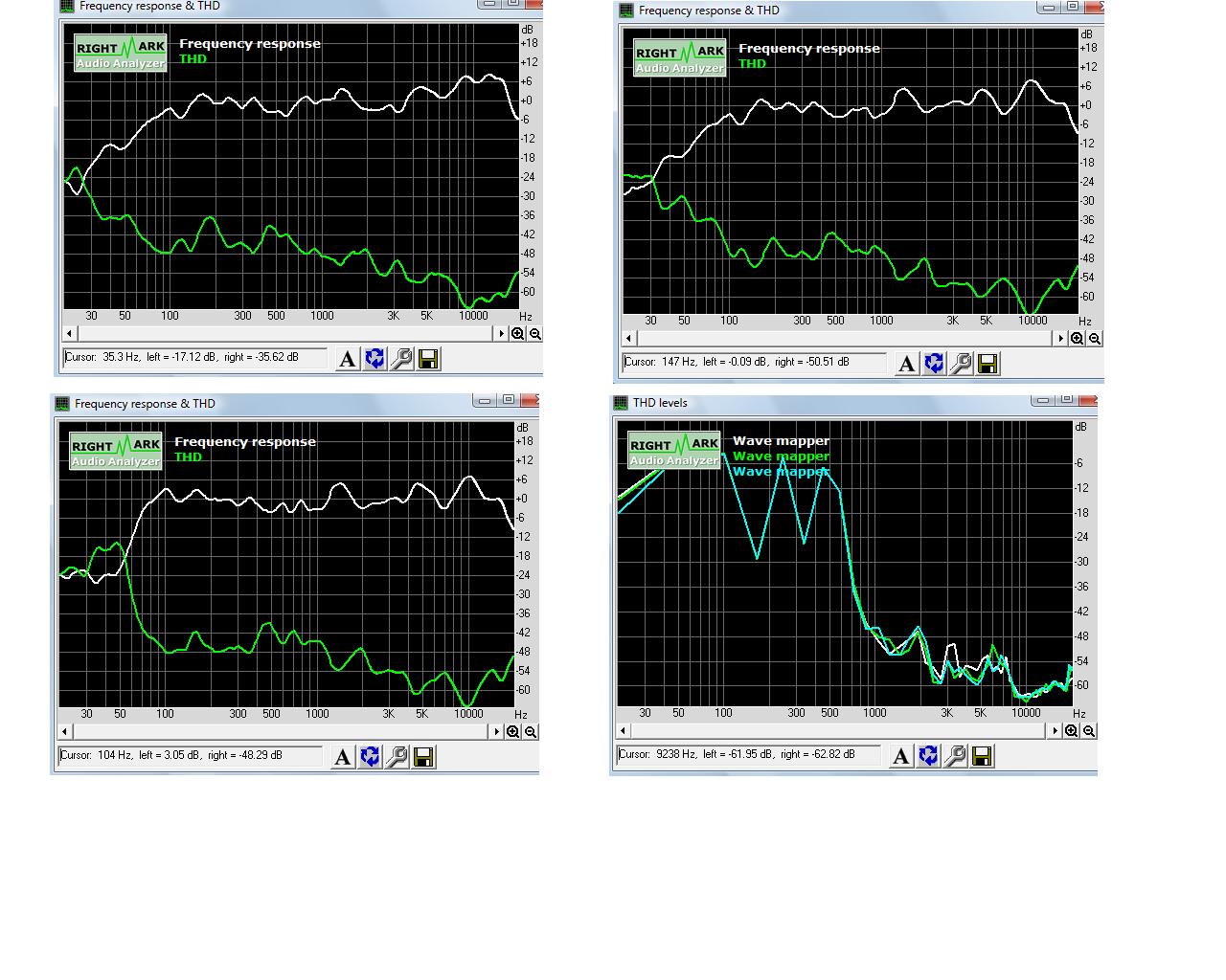 Два верхних графика, это разные АС лев. верх - со всеми ВЧ динамиками и передней мордой с удлиненной примерно на 8 см трубой фазоинвертора, прав верх - с одним ВЧ динамиком и просто с дыркой в корпусе без трубы, а ниж. лев - без доп корпуса.