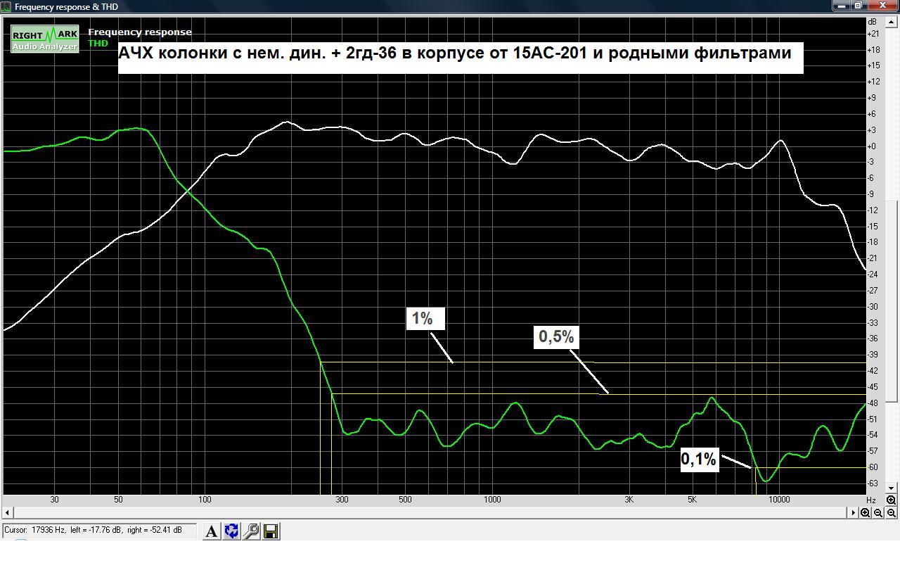 Интереса ради снять АЧХ, искажения и ФЧХ работы этих динамиков во всем корпусе. У немецкого динамика в таком объеме появился достаточно сильный провал на 150-400 Гц. Я его раньше ставил в корпус 15 АС-201 с родными фильтрами и ВЧ динамиком 2гд-36 - очень неплохие были результаты. Как звено для трехполски - хороший вариант. Неравномерность от 150 Гц практически до самого верха порядка +-3 дБ и искажения очень низкие.