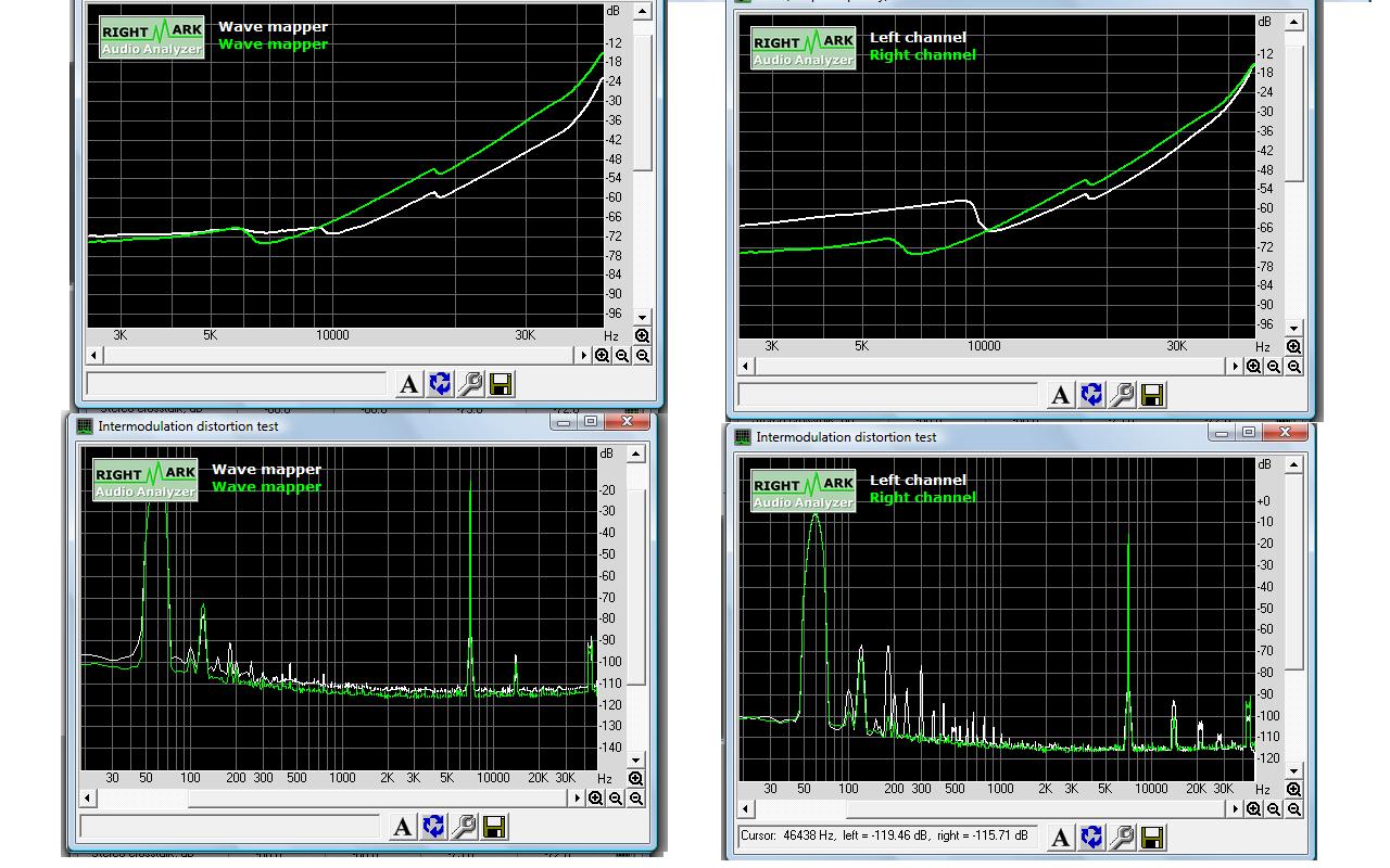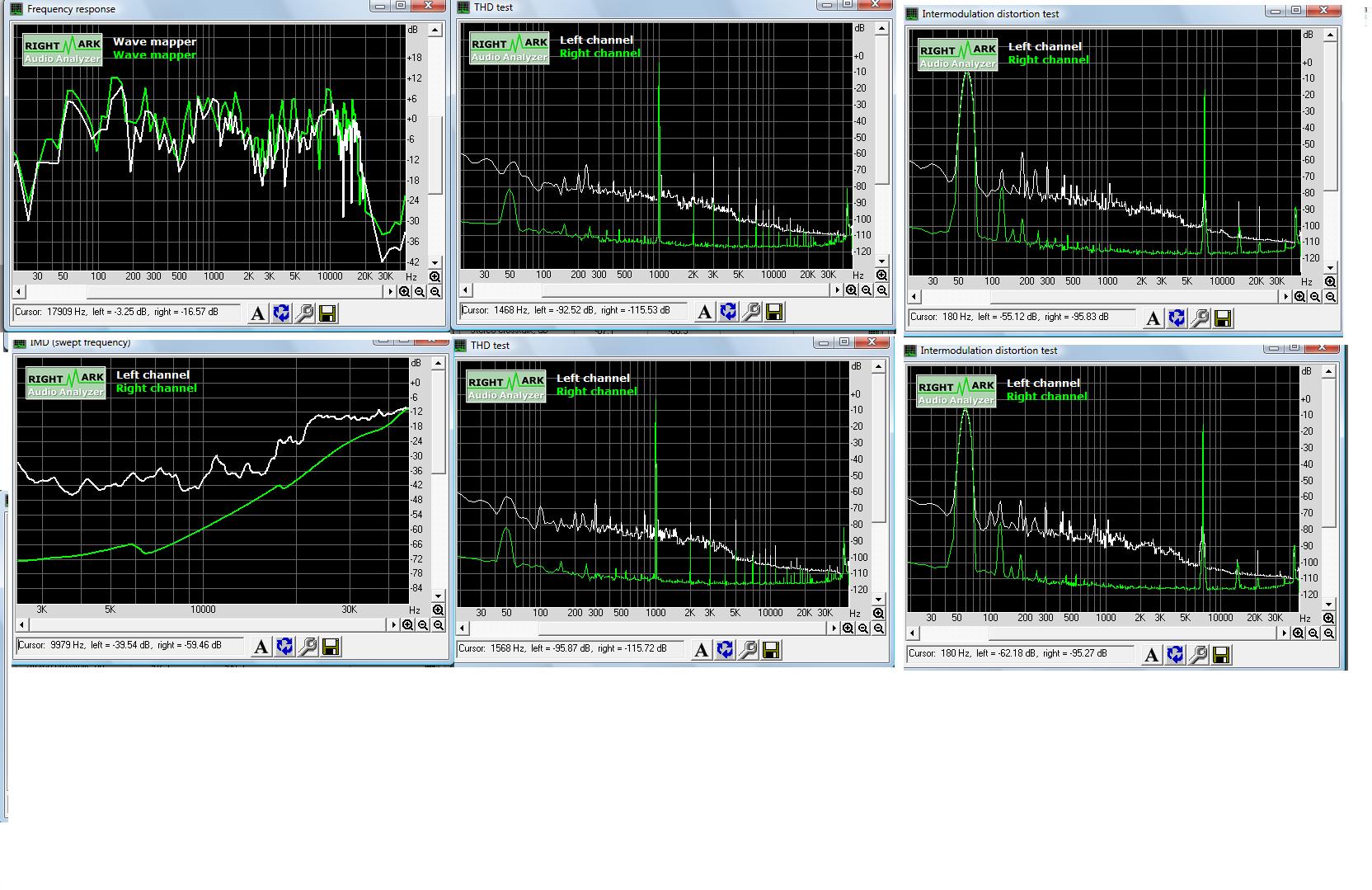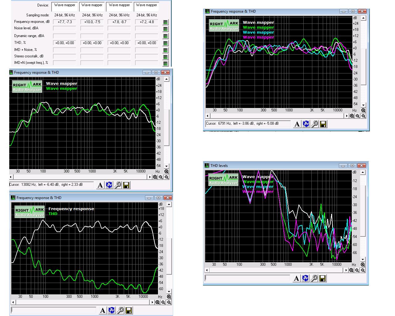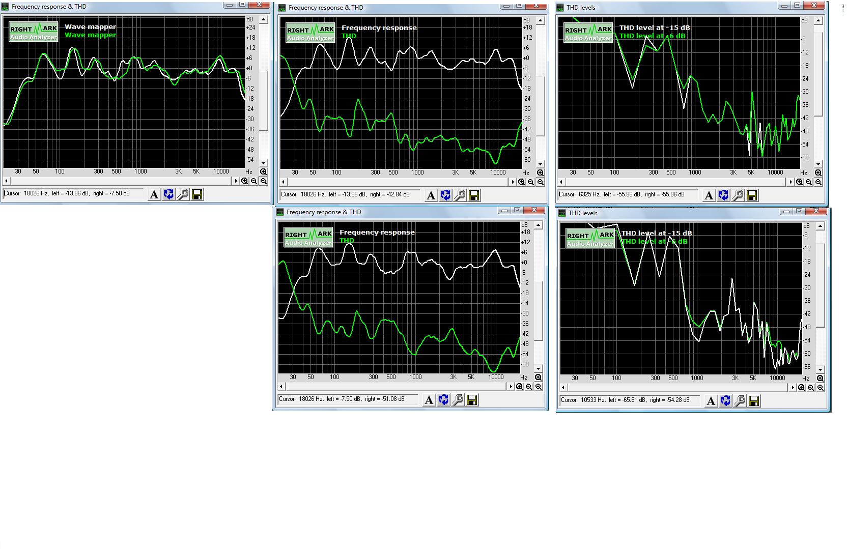 Пытался снять АЧХ и искажения по программе RMAA5.5 не получилось. Она работает при уровне на 1 кГц не менее - 10-12 дБ от нулевого уровня, выше которого уже измерения получаются с искажениями. Поэтому снял АЧХ всех динамиков по программе REW V5. Это очень удобная многофункциональная программа - есть десятки вариантов измерения различных параметров с использованием различных типов сигналов (встроенный генератор белового, розового шума, синуса, нескольких свип - сигналов, измеритель искажений 2, 3, 4... гармоник и сигнал плюс шум искажений и др.)