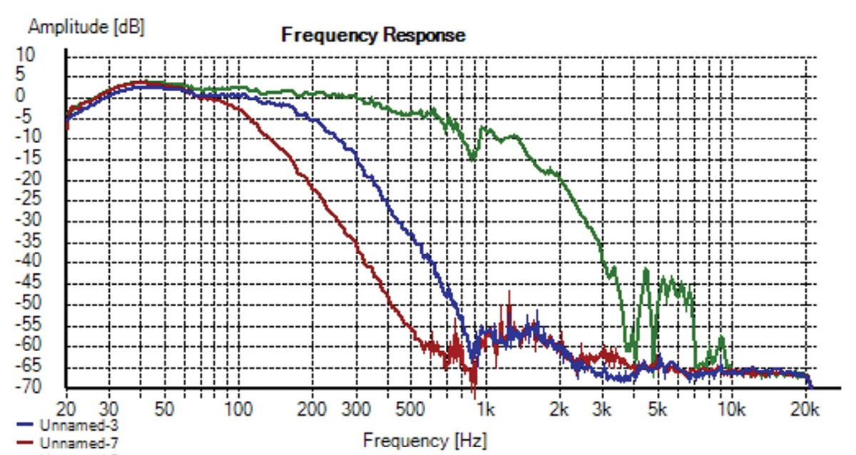 Также известно, что на этих низких частотах очень близкие измерения микрофона на акустической оси динамика пропорциональны измерениям на расстоянии 1 метр в безэховой камере или в свободном поле. На рис. 3 показан 6-дюймовый динамик, измеренный на акустической оси сабвуфера с отключенным кроссоверным фильтром (зеленый), настроенным на частоту 100 Гц (красный) и, наконец, 200 Гц (синий).