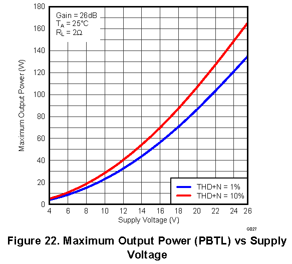 Нагрузку 2 Ом подключить можно, Максимальная выходная мощность при 12В питании и PBTL включении составит 32 Вт (пересечение синей линии графика с вертикальной линией 12В), но чтобы ее получить источник питания должен обеспечивать минимум 4А на канал, 8А соответственно на стерео вариант, то есть если брать автомобильный аккумулятор на 40 ампер-часов, стереоусилитель посадит его за 5 часов, но это при синусоидальной мощности, при музыкальной проработает раза в 2 дольше - 10 часов. Если брать литий-ионные аккумуляторы на 2500 мА-часов (это при том что надо высокотоковые, как для шуруповертов), они сядут за 18 минут при синусоидальной мощности или 30-40 минут при музыкальной.