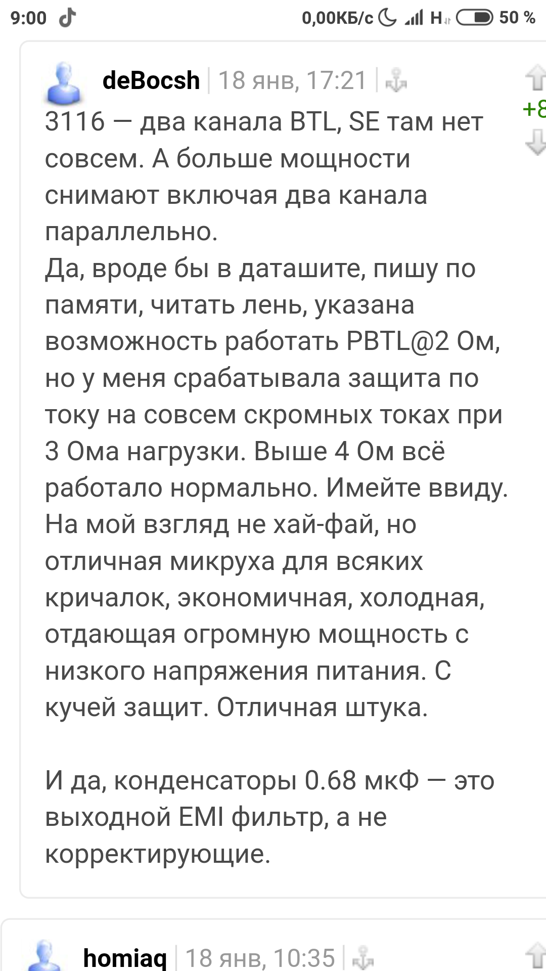 Вот это ДА! ? А можно фото этого унч? Пересмотрел несколько усей на tpa 3116, и у всех были абсолютно неправильные (очень экономные) выходные фильтры, оттого завал наверху, самая низкая частота работы этой МС из возможных и проблемы на низких частотах из-за плохого демпфирования динамика. Может, у Вас нормальный усилитель, с частотами и номиналами из даташита, как минимум?