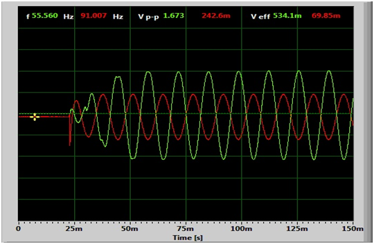 Максимумы выхлопа трубы там, где и должны быть – напротив максимумов колебания дина (зеленые линии) и выхлопа трубы (нижний скан),