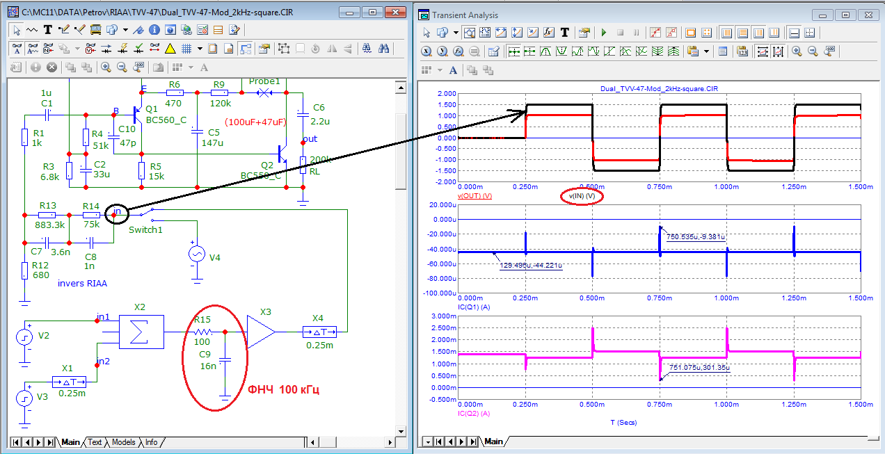 Как у тебя выходит, что ты подал на вход сглаженный меандр, а хвастаешься восстановленным чистым меандром? Откуда на выходе взялись лишние гармоники выше 100 кГц, которые ты на входе срезал ФНЧ 100 кГц, и как это коррелирует с тем, что ФНЧ 100 кГц на схемах нету, хотя ты говоришь - есть?