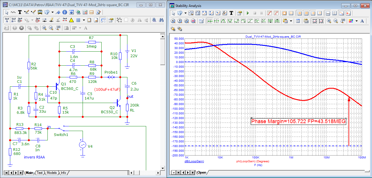 ну почему же неизвестно...Следует обратить внимание на то, что в заводской схеме цепь RIAA запитана от высокоимпедансного источника (в той мере, в какой на это способен каскад ОЭ и позволяет нагрузка корректора). А в переделанной - от эмиттерного повторителя. Что там произошло с и так смешным петлевым усилением, - не известно даже петрупятьдесятпервому...