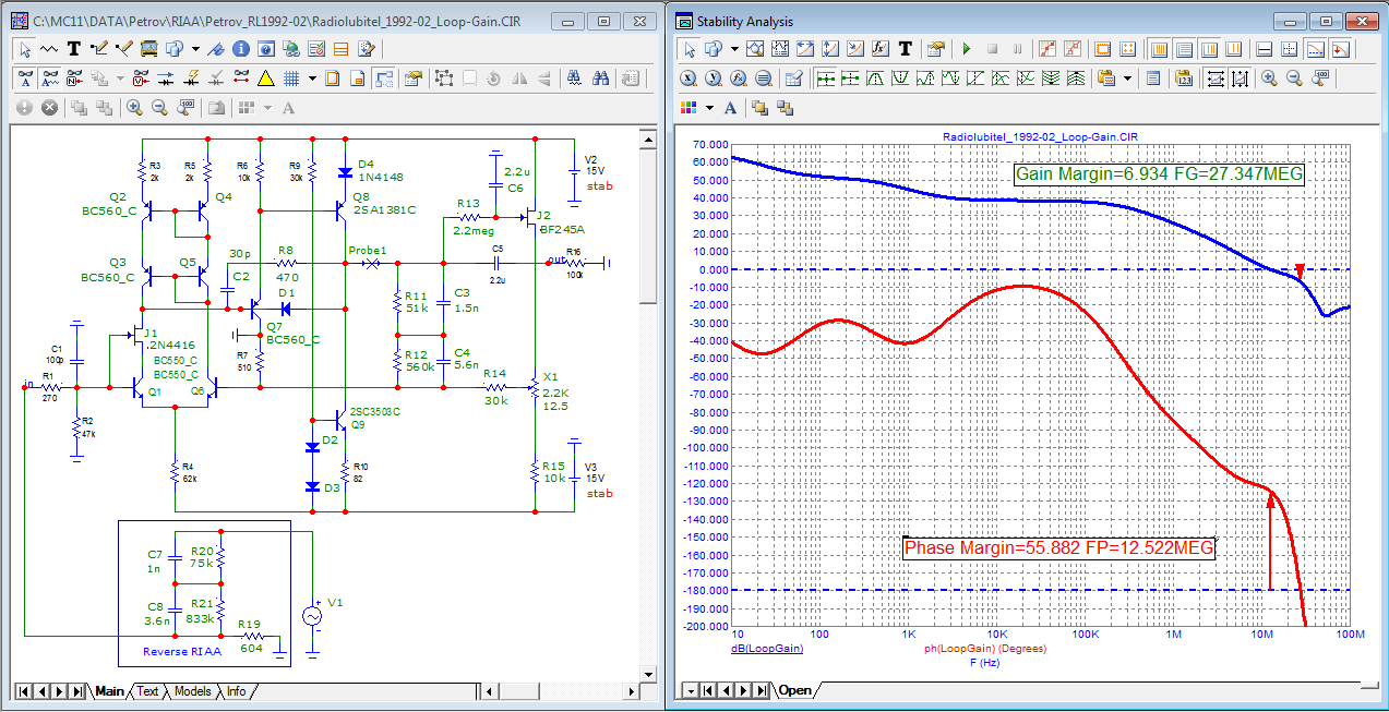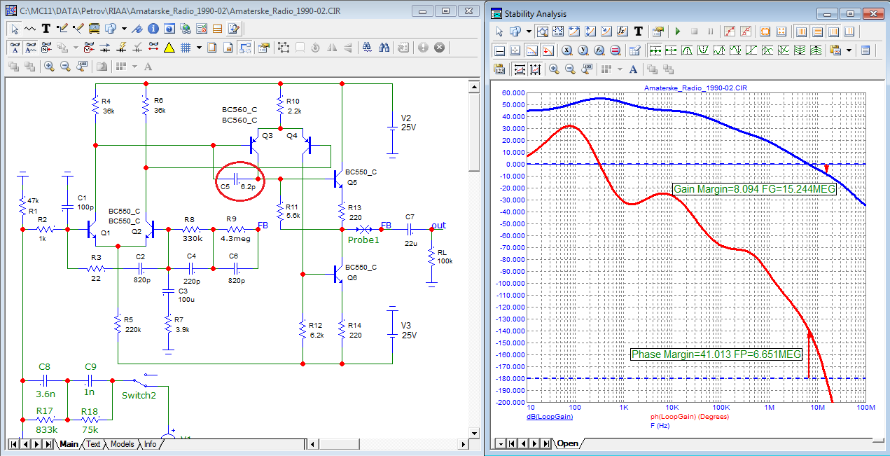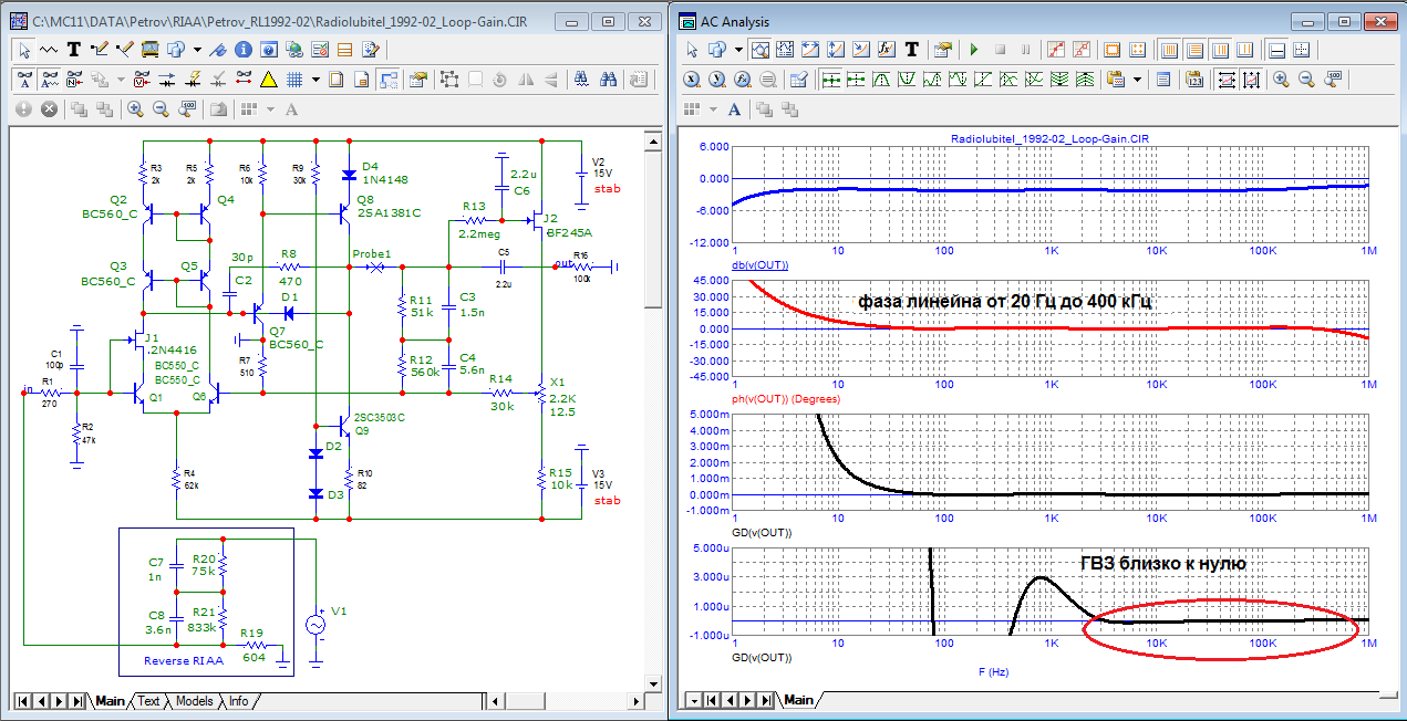 что касается усилителя из болгарского журнала, то я добавил лишь один небольшой конденсатор, возможно с оригинальными транзисторами он и не нужен. Вот его схема, диаграмма Боде и петлевое усиление. Обратите внимание на ГВЗ в диапазоне частот 1 кГц и выше, оно близко к нулю!