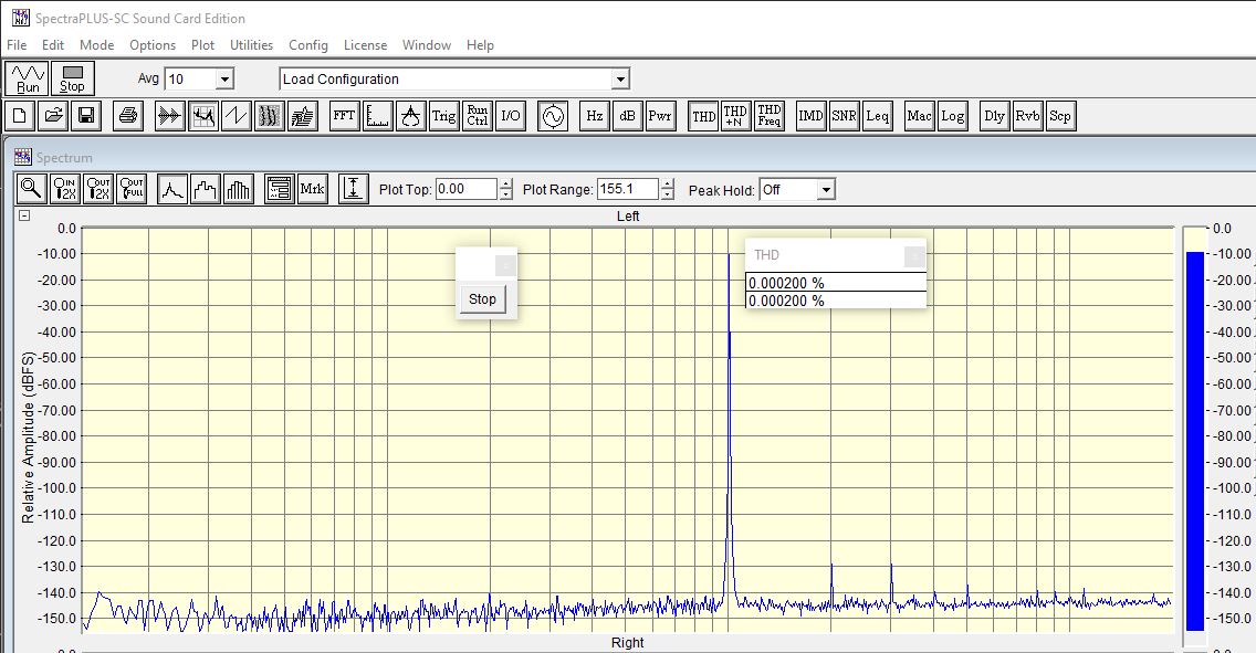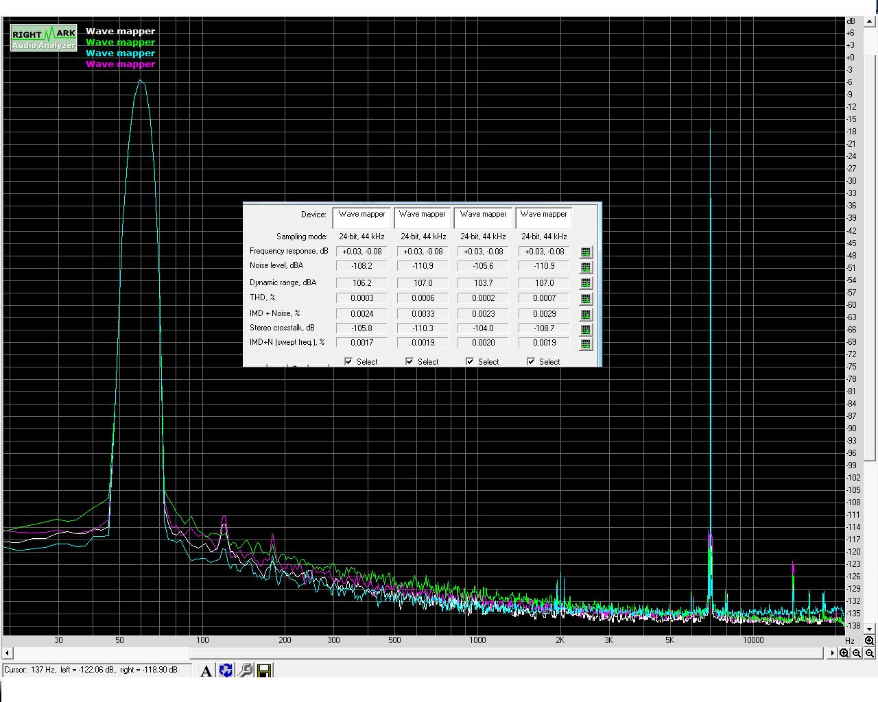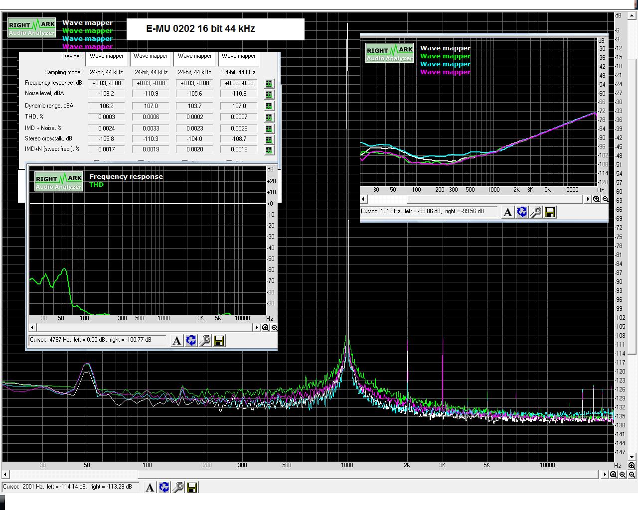 А эта карточка три года назад, на той же коробочке, давала примерно такие параметры ( правда программа другая RMAA - в ней получалось намерить поменьше искажений, чем в REW). ХОТЯ В REW можно намерить и не такое в некоторых режимах и даже те же 0,0002% тоже получалось получить, но настройка требует времени - нужно согласовать уровни и чуйки всех программ и входов по минимуму искажений. Там нелинейная зависимость - нужно поэкспериментировать...)))