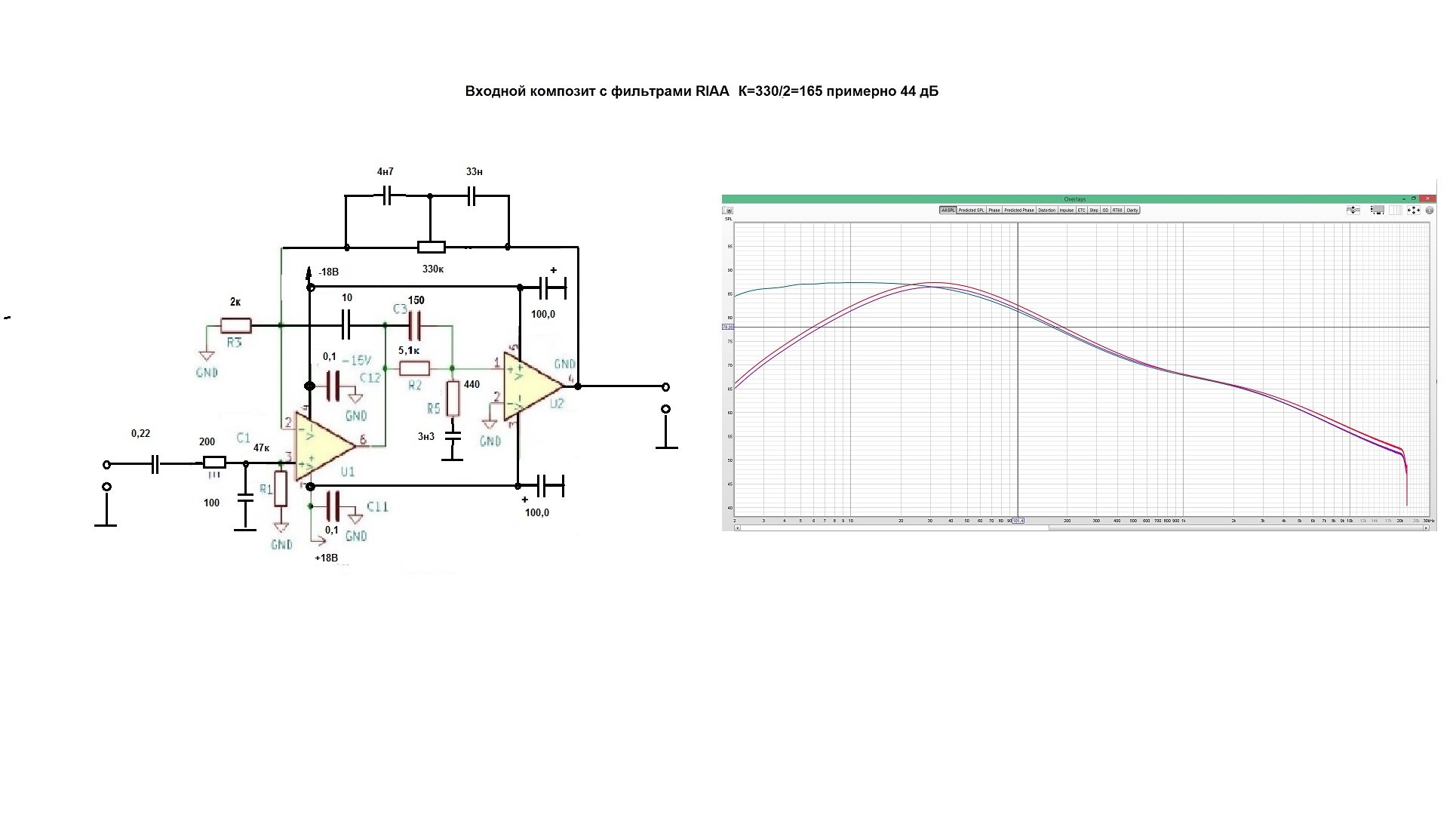 А точку перегиба АЧХ легко определить ( и двигать по частоте и как бы вверх вниз по амплитуде) с помощью подстрочного резистора (в моем варианте 330к) под конкретные конденсаторы. а они определяют частотный сдвиг этих наклонных АЧХ. Тут задача поиска точной АЧХ корректора резко упрощается - проще подобрать два резистора после поиска оптимальных их значений, чем подбирать два конденсатора и два резистора.)))