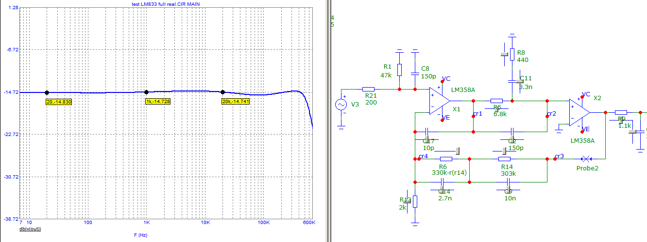 Крутизну наклона АЧХ можно слегка менять RC цепочкой в фильтре между ОУ. С емкостью ( 3н3) - синий график, без этой емкости - просто делитель - красный график. Думаю, что 3н3 не совсем оптимальный номинал, Надо попробовать 470-1н5. Эта емкость позволяет также несколько снижать ИМИ.
