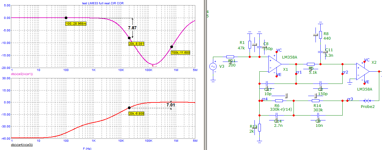Обе коррекции отъедают усиления на 20 кГц примерно 14 дб. (это я уже посмотрел в программе), остаток - на графике - 53 дб. Итого: 53+14 и делим на две микросхемы - получаем усиление одной