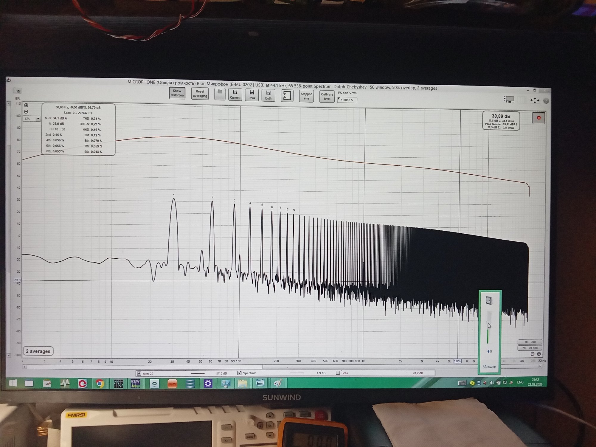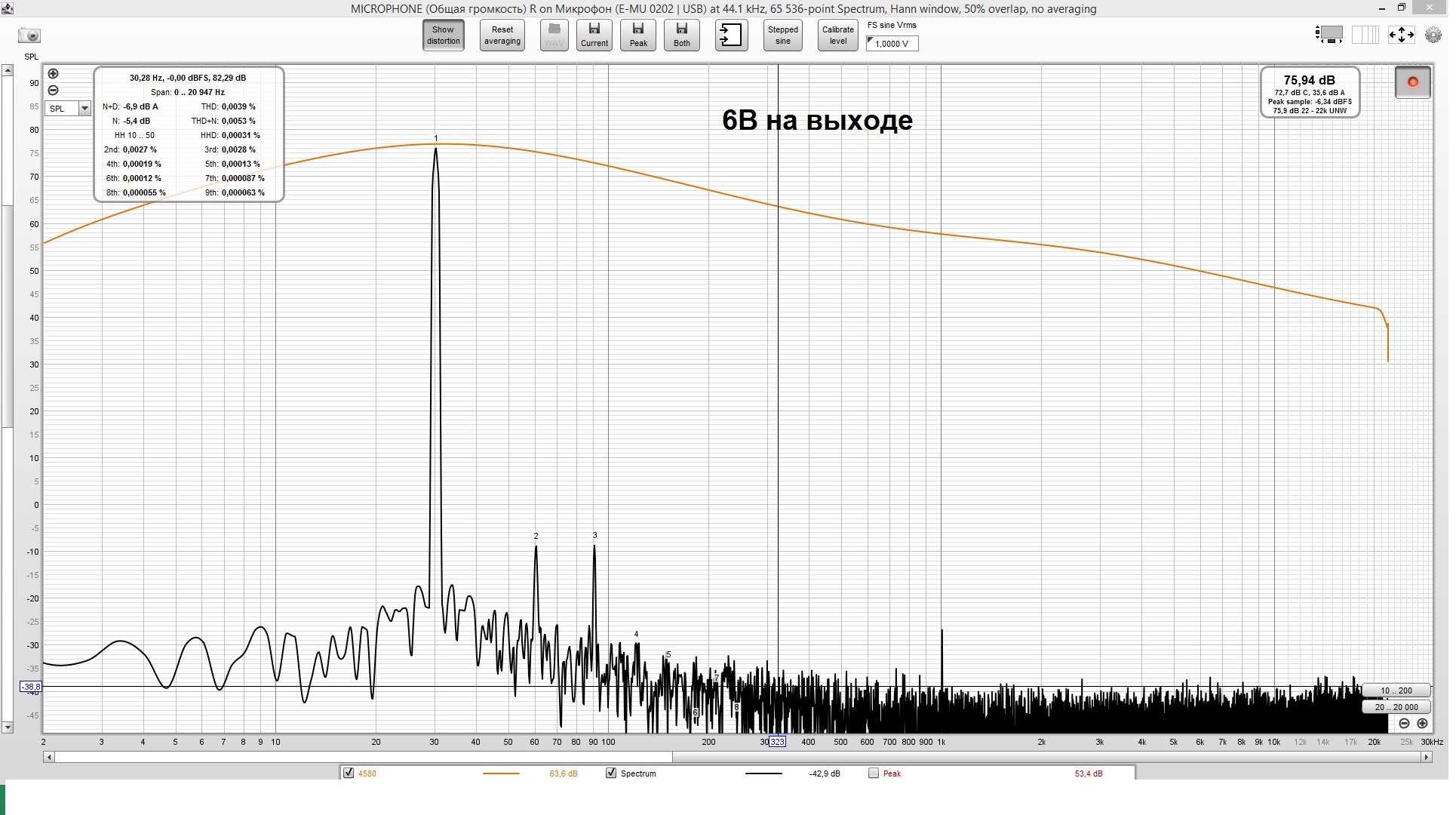 Поигрался с усилением в плане получения минимальных искажений. Почти угадал с резистором. Оптимальное значение где-то в районе 1,5к. а усиление на 30 Гц 343к (показания сопротивления тестером)/1,5к = 341,5. Примерно 51дБ. Ниже 0,000004% EMU-0202 не показывает. _poka