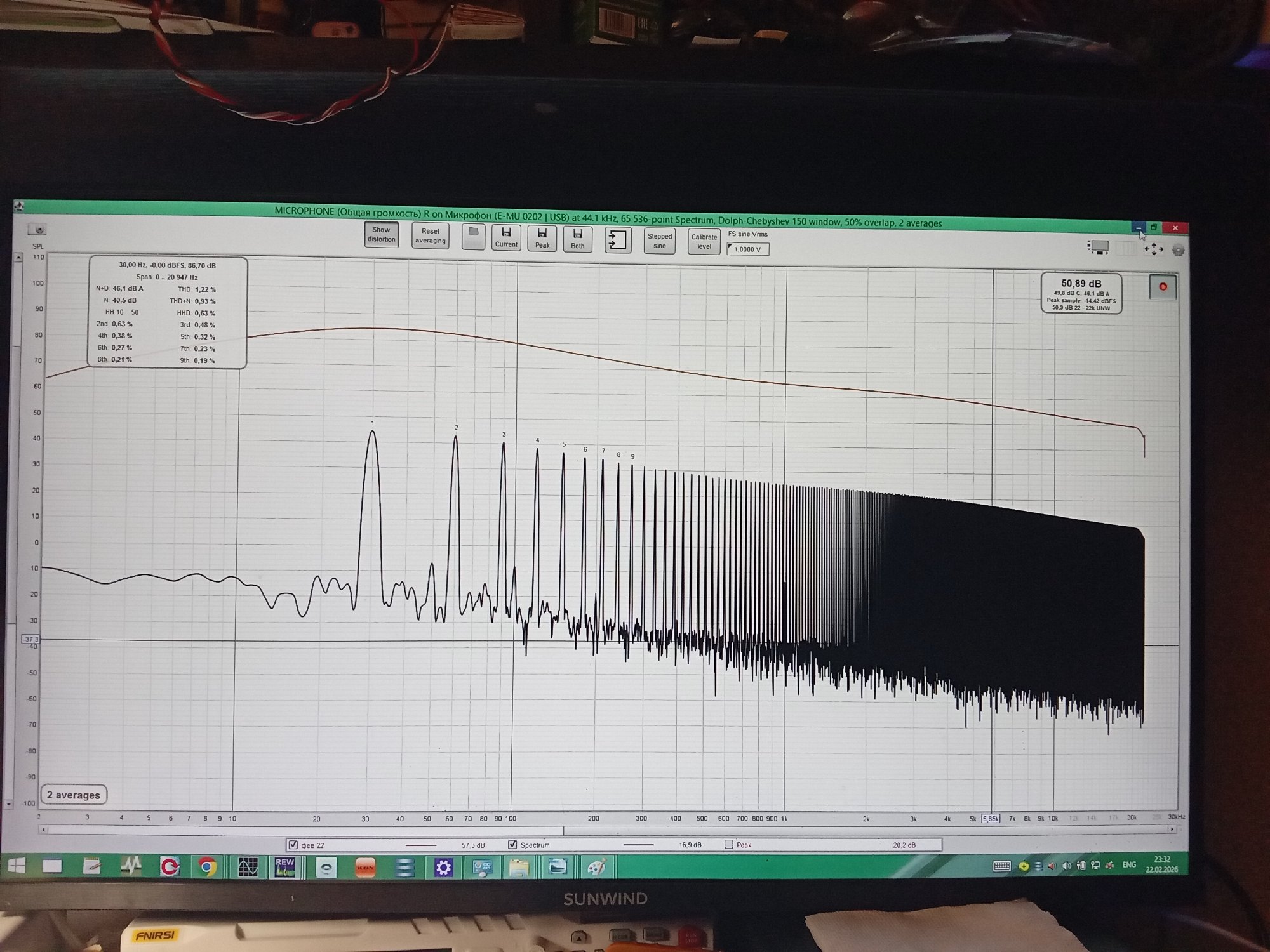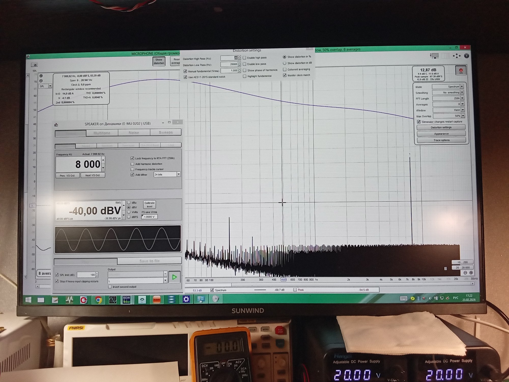 На моём графике искажения на уровне ниже -110 дБ (они обозначены цифрами 2, 3, 4, 5, 6 ... - по номеру гармоники частоты 1 кГц). А палка под -70 дБ - это сетевой фон 50 Гц, т.к. при этих измерениях печатная плата не была спрятана в экран.