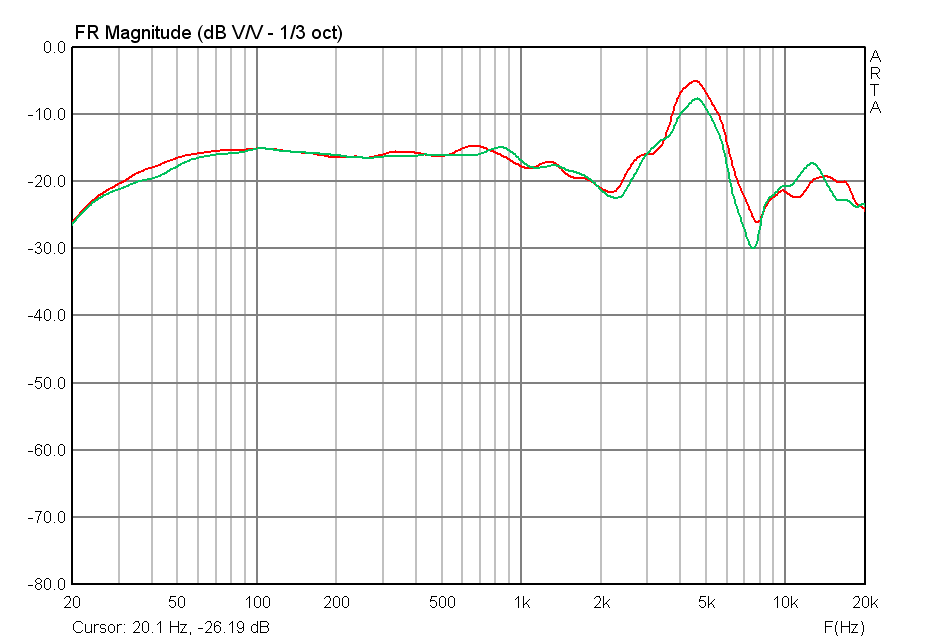 На красной линии при желании, сгладить область 5...6 кГц стало гораздо проще. Средние частоты стали намного более ровными, звук похож на звук колонок.