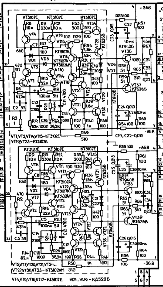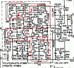 Зона 3: два хаксфордизированных каскода, таких же, как во входном дифе. По сравнению с МАСТЕРом нет повторителей перед Т16, Т34, поэтому малО входное сопротивление второго дифа и усиление первого дифа полностью не реализовано. Но для досимуляторной эпохи и этого выше крыши. Человек явно понимал, что делал - а это не часто встречается.