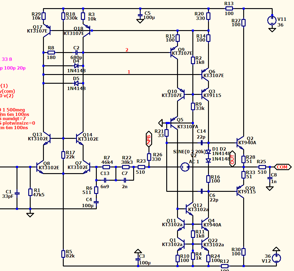 - Схема с двумя дифами и токовым зеркалом даже при прочих равных имеет минимум на 6 дБ большее петлевое усиление, чем суховский и ямаховский УК по топологии Линна.
