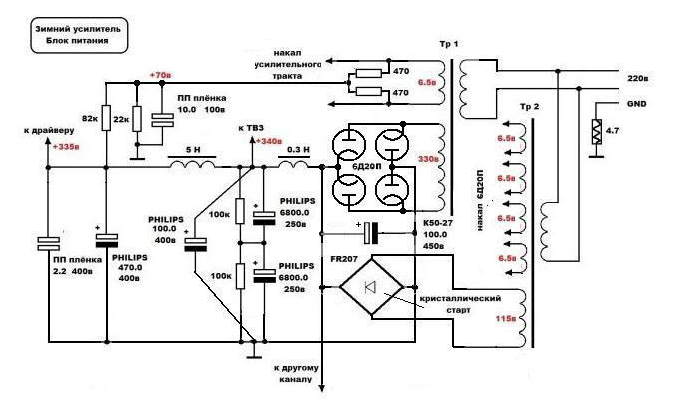 В оригинале схема разработана для использования выходных трансформаторов от 90У-2 (ТР-224, ТР-224-203, ТР-597-479) и для их утилизации ничего лучше не придумано. Получающиеся 5-6 ватт не требуют умощнения, как показала практика изготовления таких "утилизаторов".Хорошая схема. Напряжение выходного каскада можно увеличить вольт до 270, чуток побольше мощности снимем.