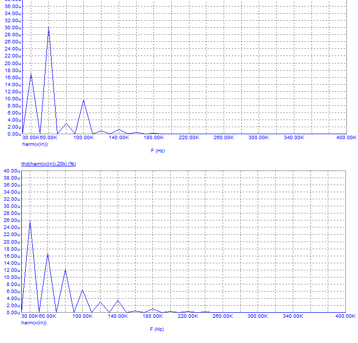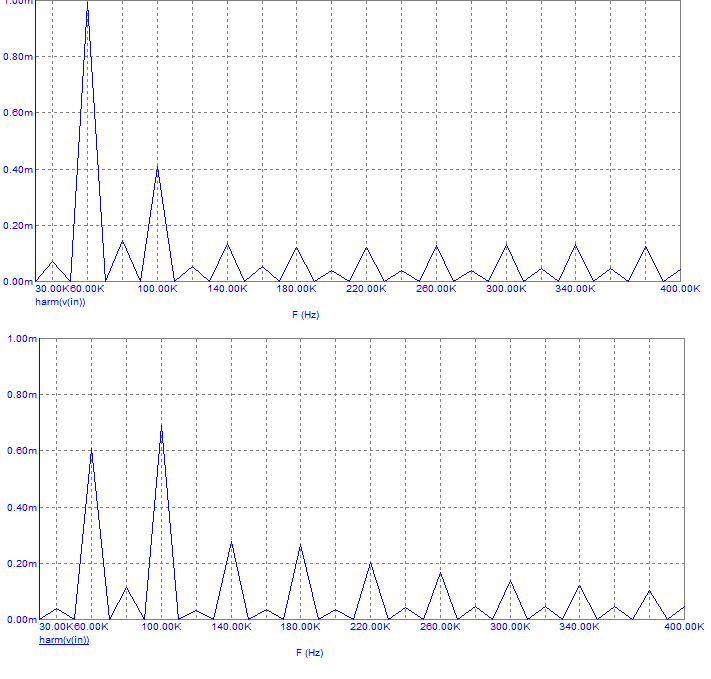 Никакой разницы в искажениях. Это значит, что никакие коммутационные искажения не доминируют в усилителе.