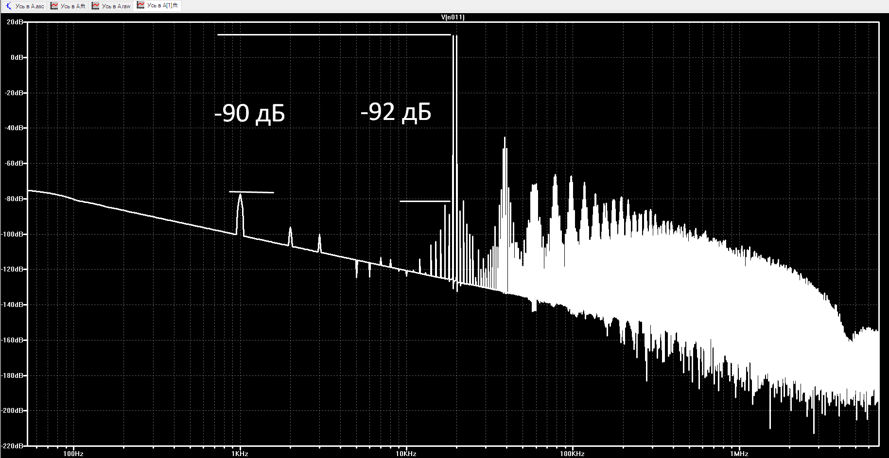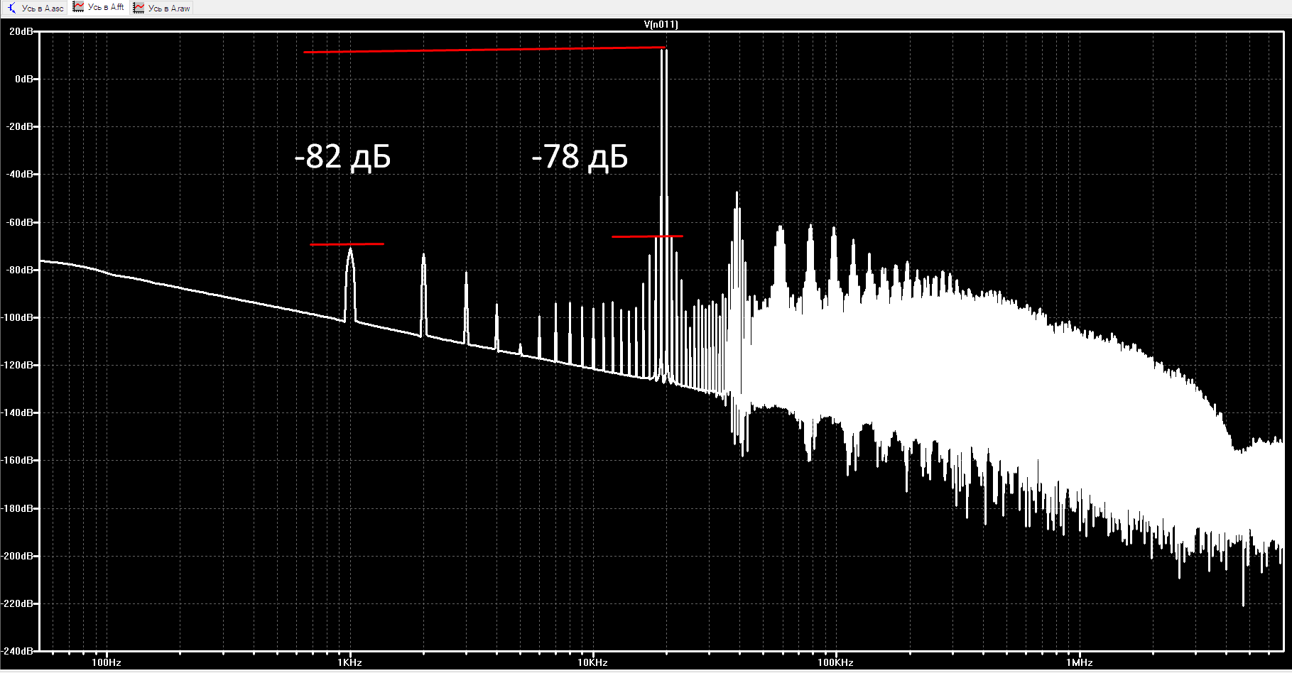 Вот спектр с батарейным питанием. Небольшая вторая гармоника и еле заметная третья - это всё!