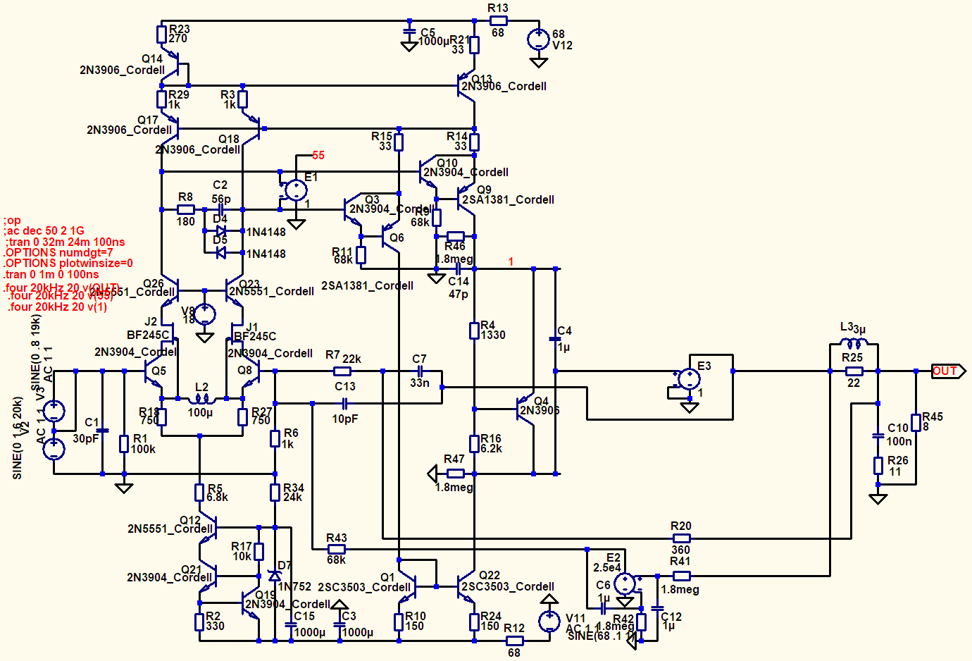 Чтобы выполнить все это, я сначала как можно точнее измерил все характеристики электроники и режущей головки и создал модель системы, которую передал симулятору (ранняя версия MicroCap). Затем я начал упрощать активную электронику, объединив как можно больше функций в несколько активных каскадов. В итоге мне удалось объединить все функции усиления, выравнивания и обратной связи в одном активном каскаде, который по-прежнему обеспечивал те же “объективные” характеристик.