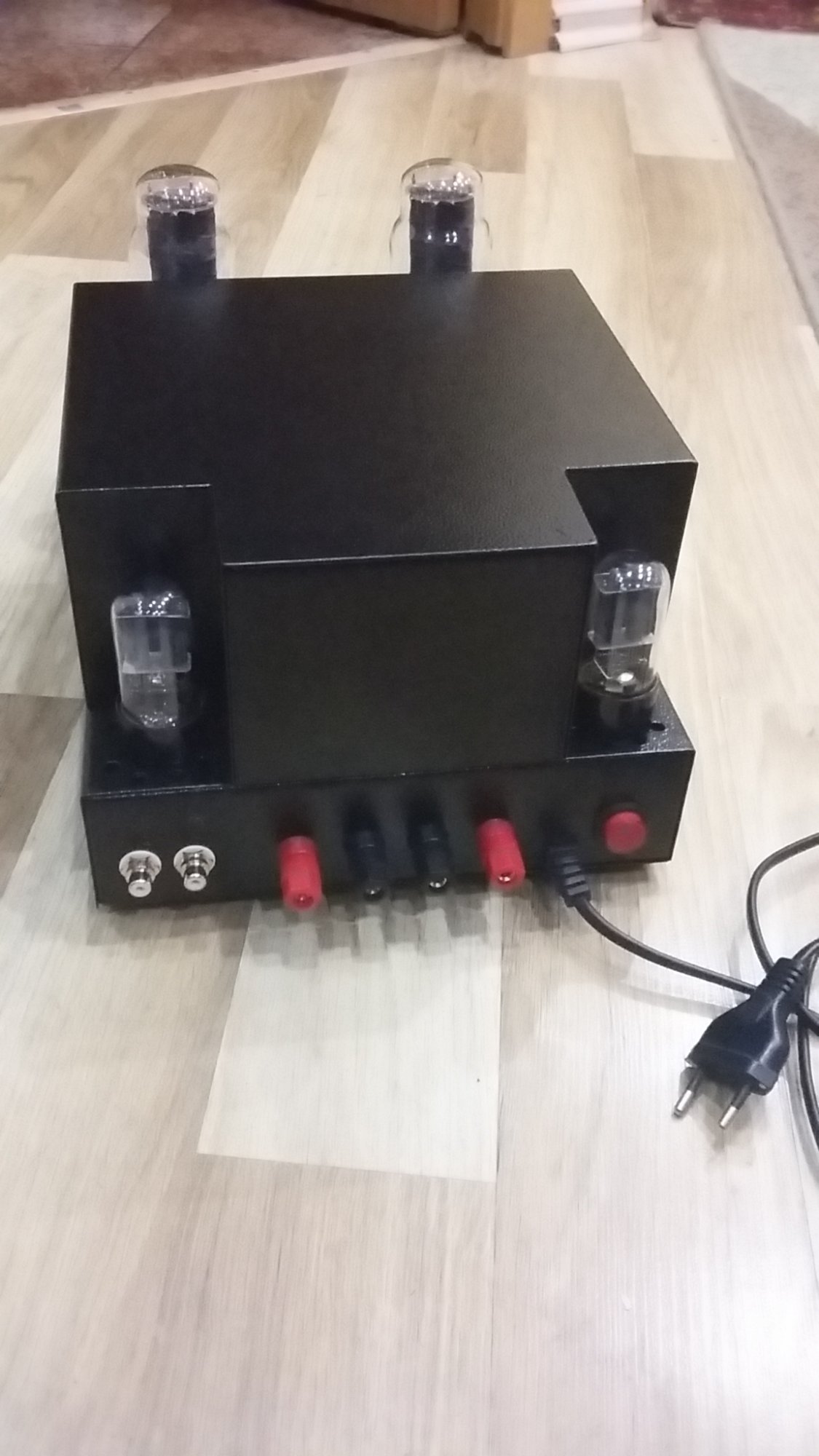 Эти откушенные углы сзади- не от хорошей жизни. Трансы отожрали кусок площади , для кенотронов спереди не было места, а углы пустые, вот и придумалось такое решение. Зато безопасно, можно на бок класть, на тыл ставить вертикально, при настройке.Кстати у АБ проскакивала знатная компоновка.