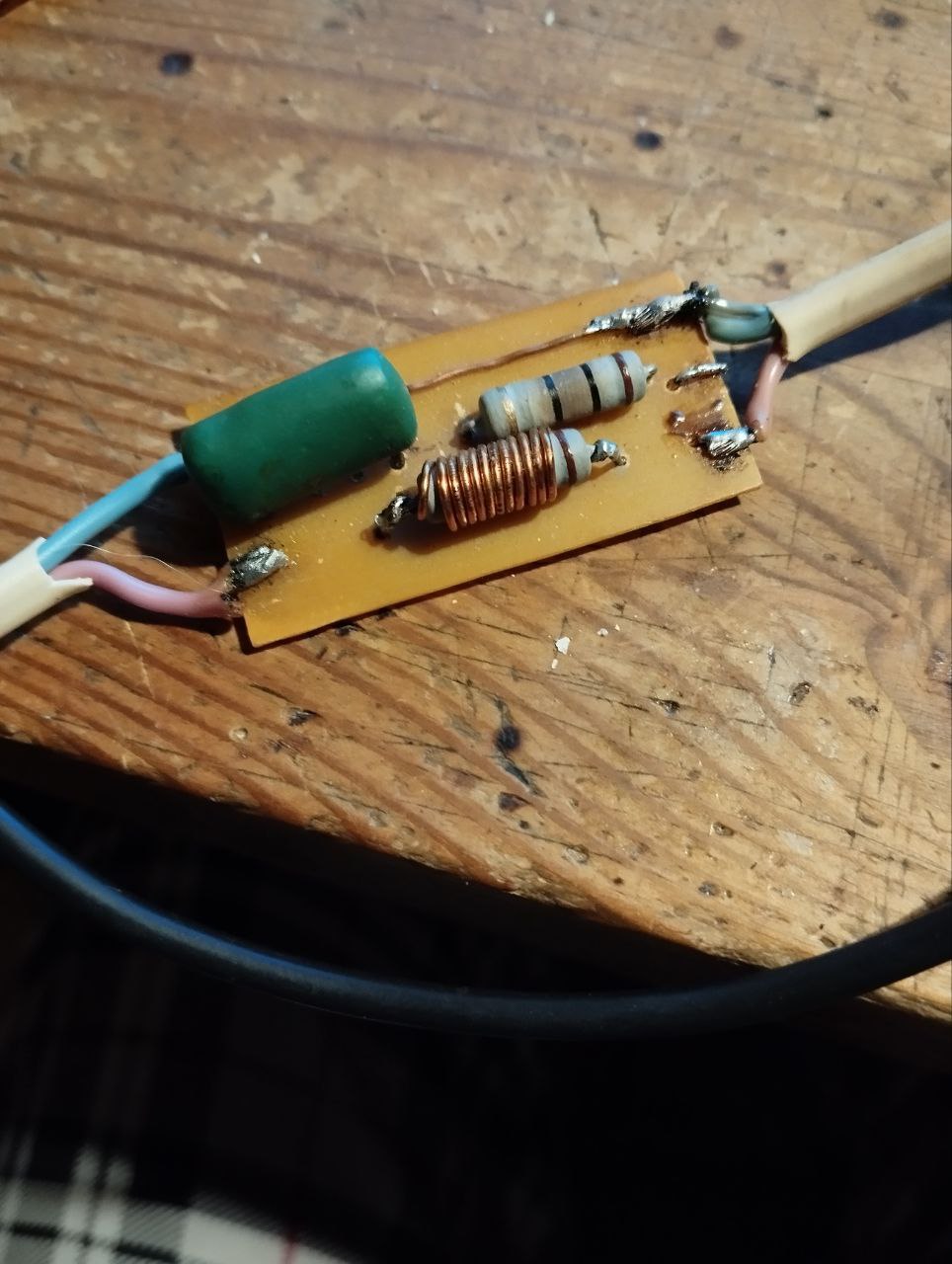 У меня так катушка стоит. В данный момент "цобелем внутрь". Но для шушурина она маловата, надо побольше витков (около 30, здесь 10) , и лучше мотать не на резистор, а на карандаш и ставить их параллельно.