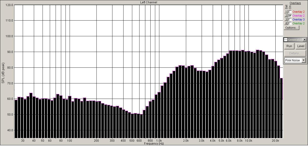 Расстояние до пищалки примерно полметра, снято вне оси, градусов 30. На оси там не так ровно, причину выяснять не было времени и сил, какие-то отраженки . Шум , розовый. Авераж бесконечность, одна девятая октавы.