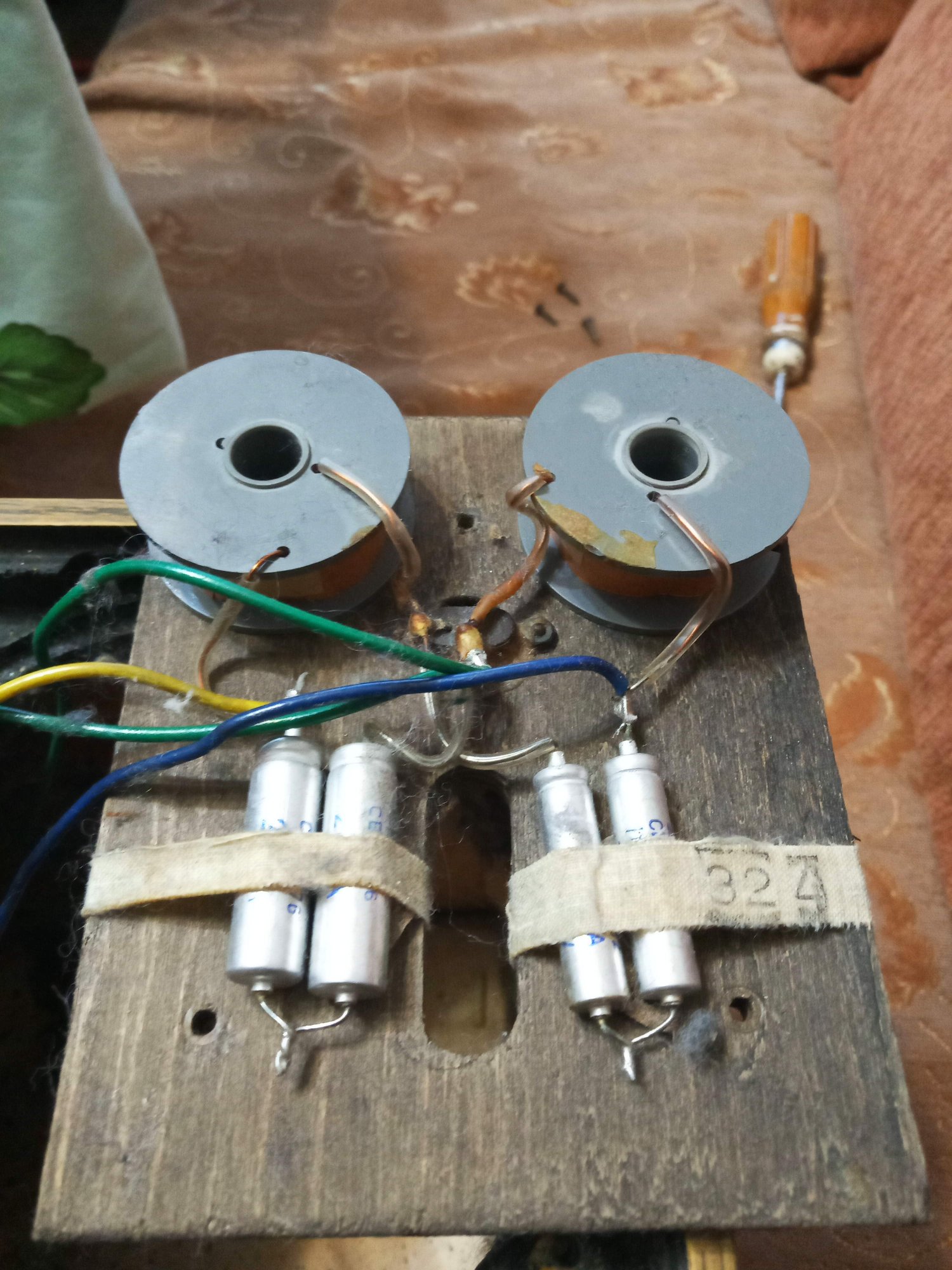 Уже вижу фильтр. Он на полярных электролитах и одинаковой небольшой толщины провода катушках, на фанерке, прикрученной прямо к выходному разъёму. Вот сие убоище: